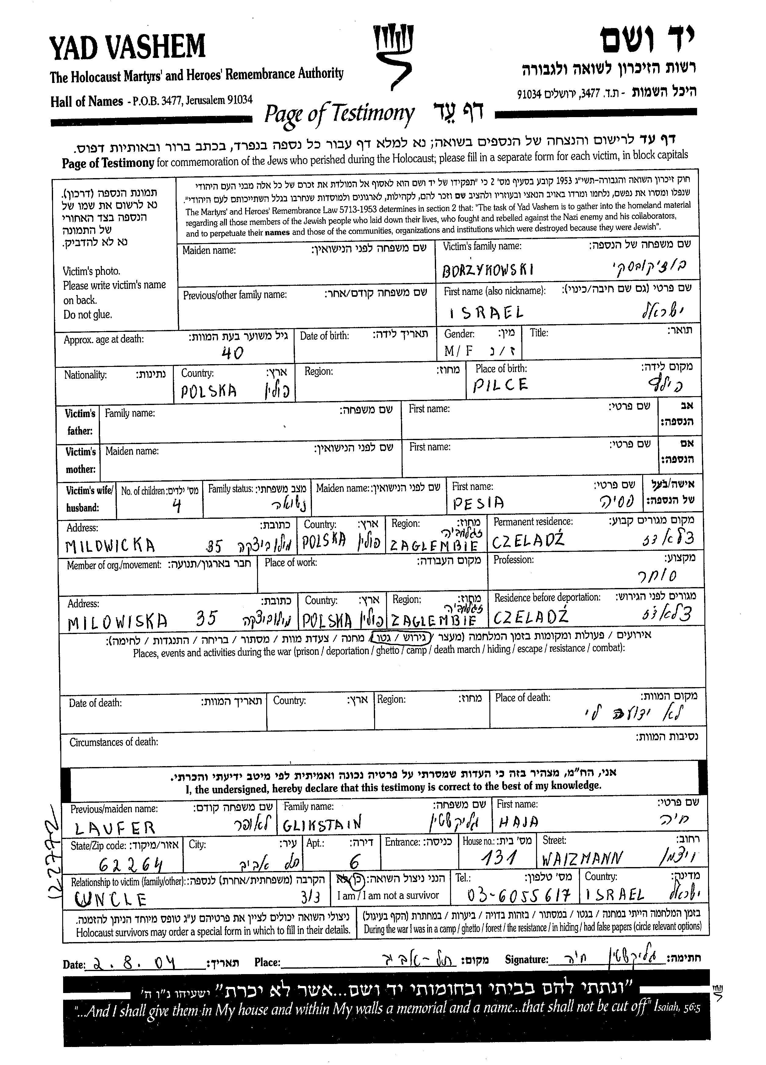 ישראל בוזיקובסקי נולד בPilc שבפולין. הוא היה נשוי לפסיה. לפני מלחמת העולם השניה התגורר בCzeladz שבפולין. בזמן המלחמה הוא היה בCzeladz שבפולין. ישראל נרצח בשואה.