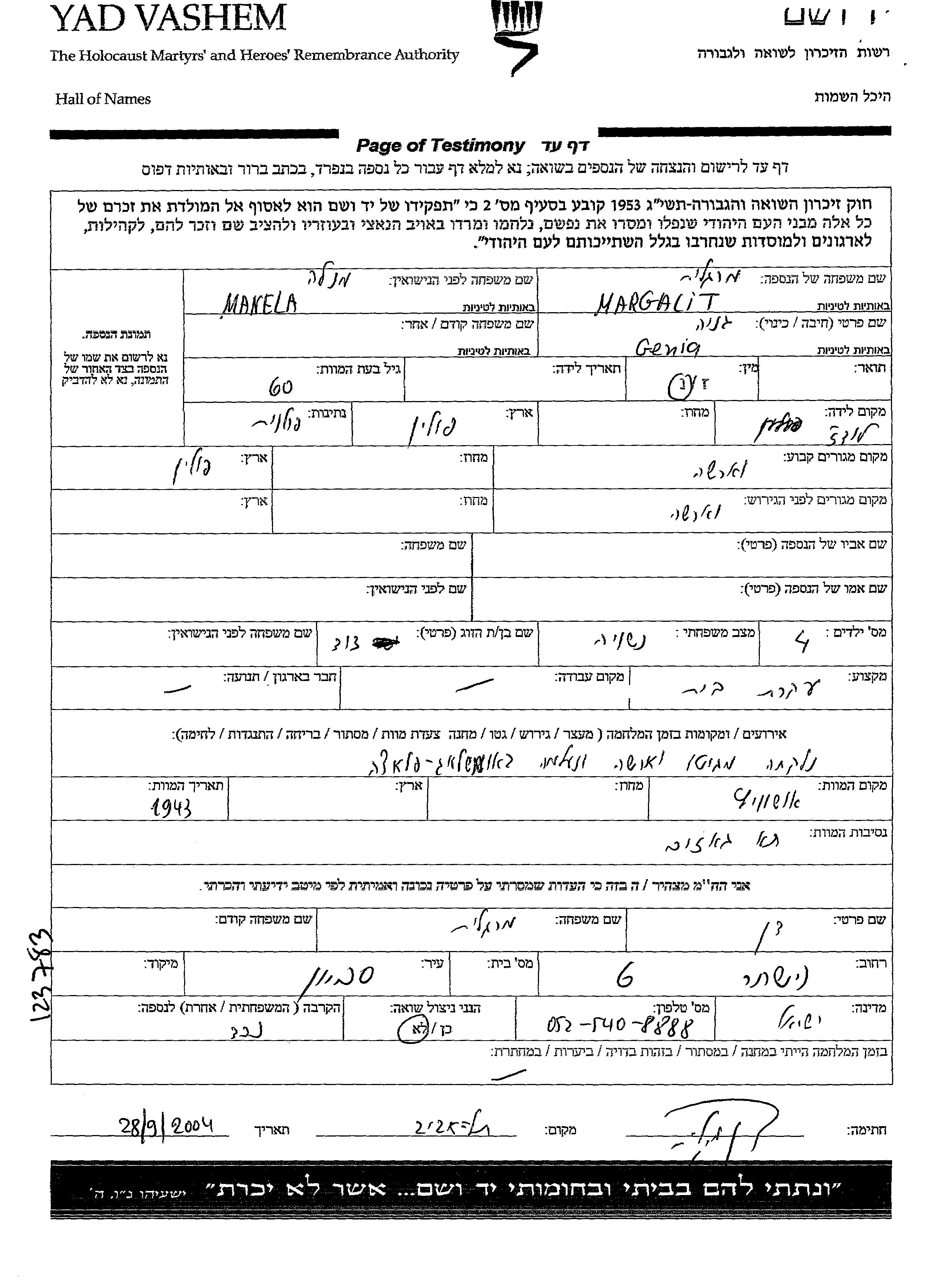 גניה מרגלית לבית מנלה נולדה בLodz שבפולין. היא היתה נשואה לדוד. לפני מלחמת העולם השניה התגוררה בVarsha שבפולין. בזמן המלחמה היא היתה בWarsaw שבפולין.