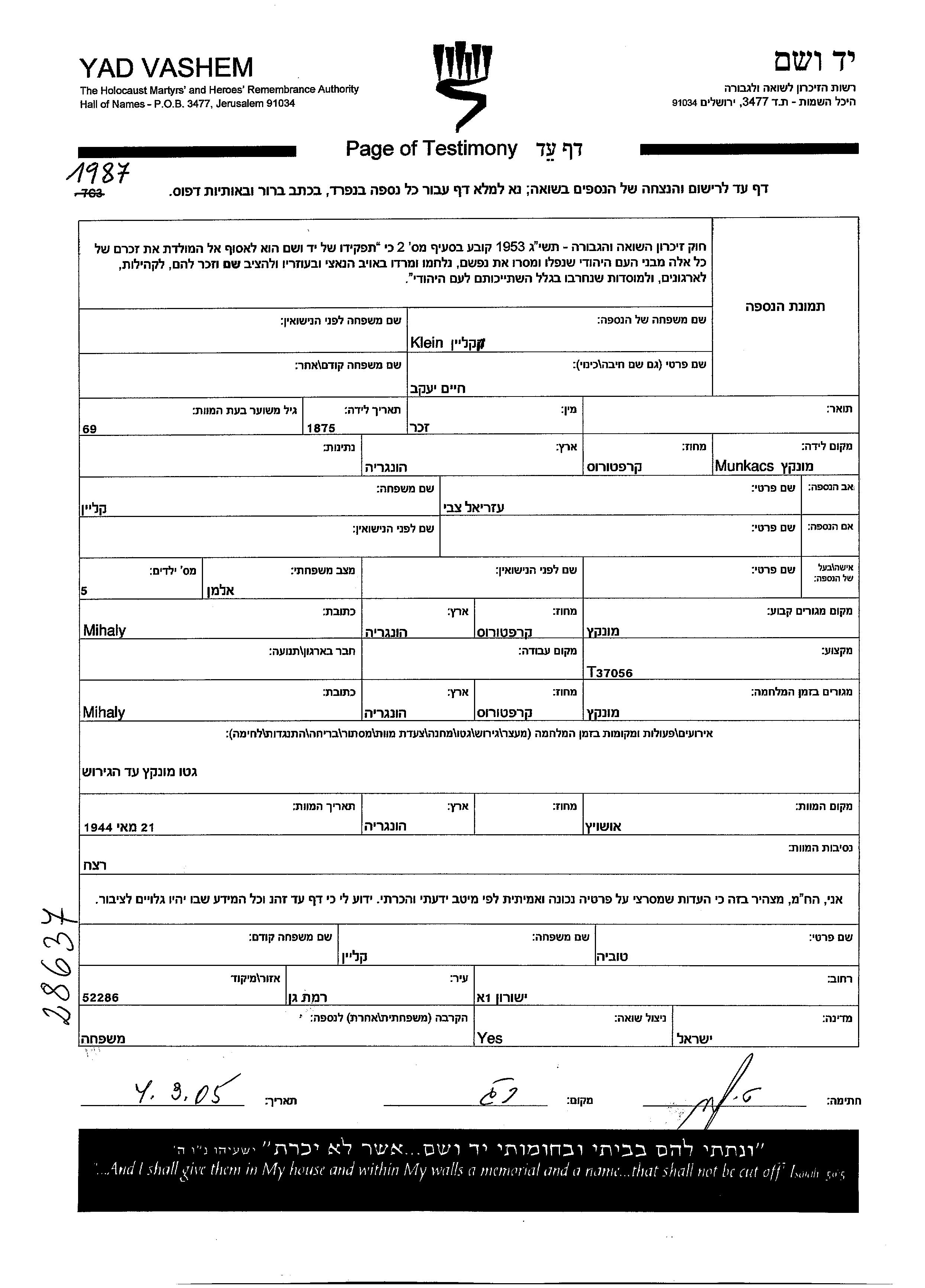 יעקב חיים קליין נולד בMunkacs שבצ'כוסלובקיה בשנת 1875 לצבי עזריאל. הוא היה אלמן. לפני מלחמת העולם השניה התגורר בMunkacs שבצ'כוסלובקיה. בזמן המלחמה הוא היה בMunkacs שבצ'כוסלובקיה.
