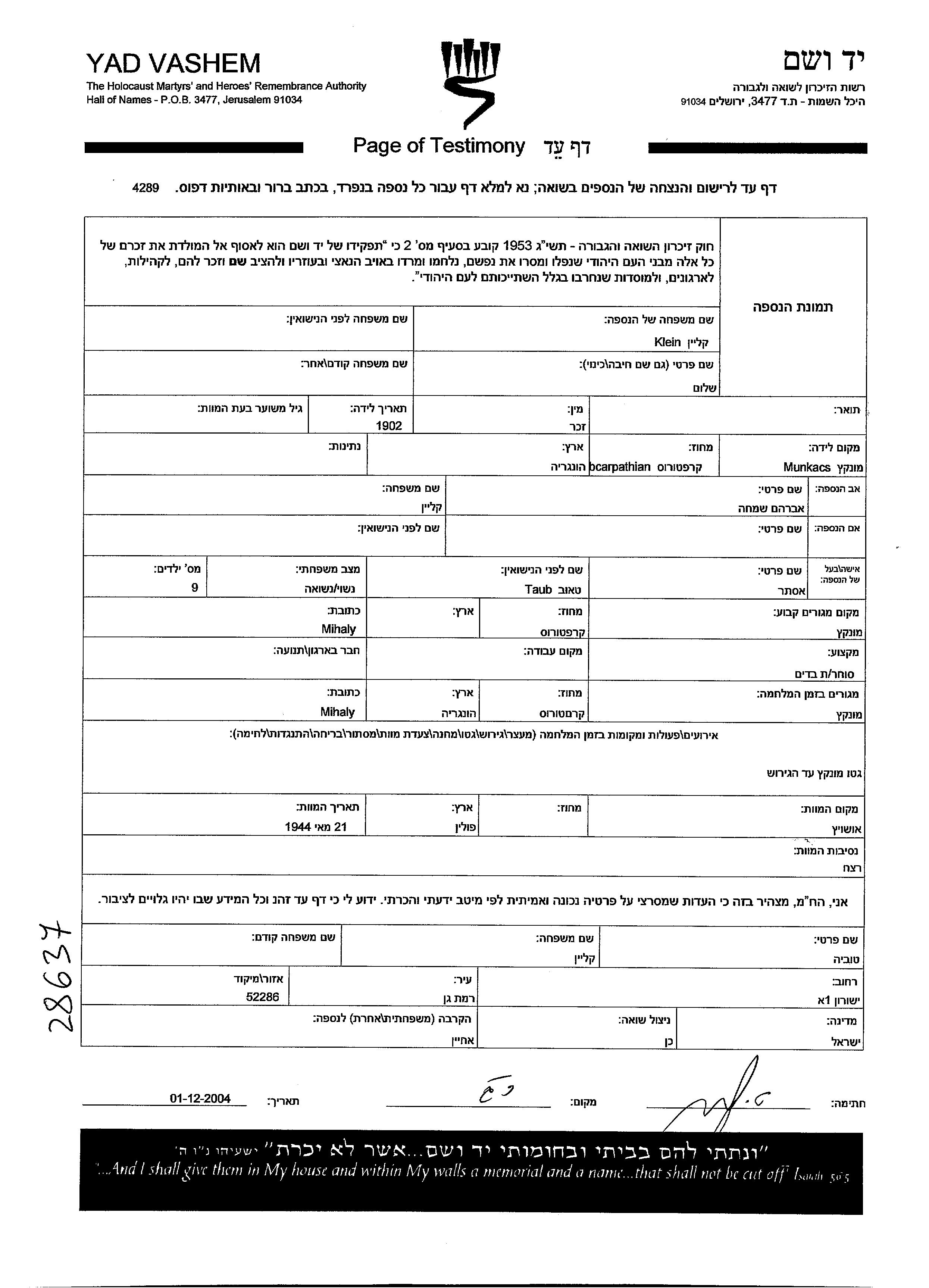 שלום קליין נולד בMunkacs שבצ'כוסלובקיה בשנת 1902 לאברהם שמחה. הוא היה נשוי לאסתר לבית טאוב. לפני מלחמת העולם השניה התגורר בMunkacs שבצ'כוסלובקיה. בזמן המלחמה הוא היה בMunkacs שבצ'כוסלובקיה. שלום נרצח בשואה. מקום המוות: Auschwitz שבפולין בשנת 21/05/1944.