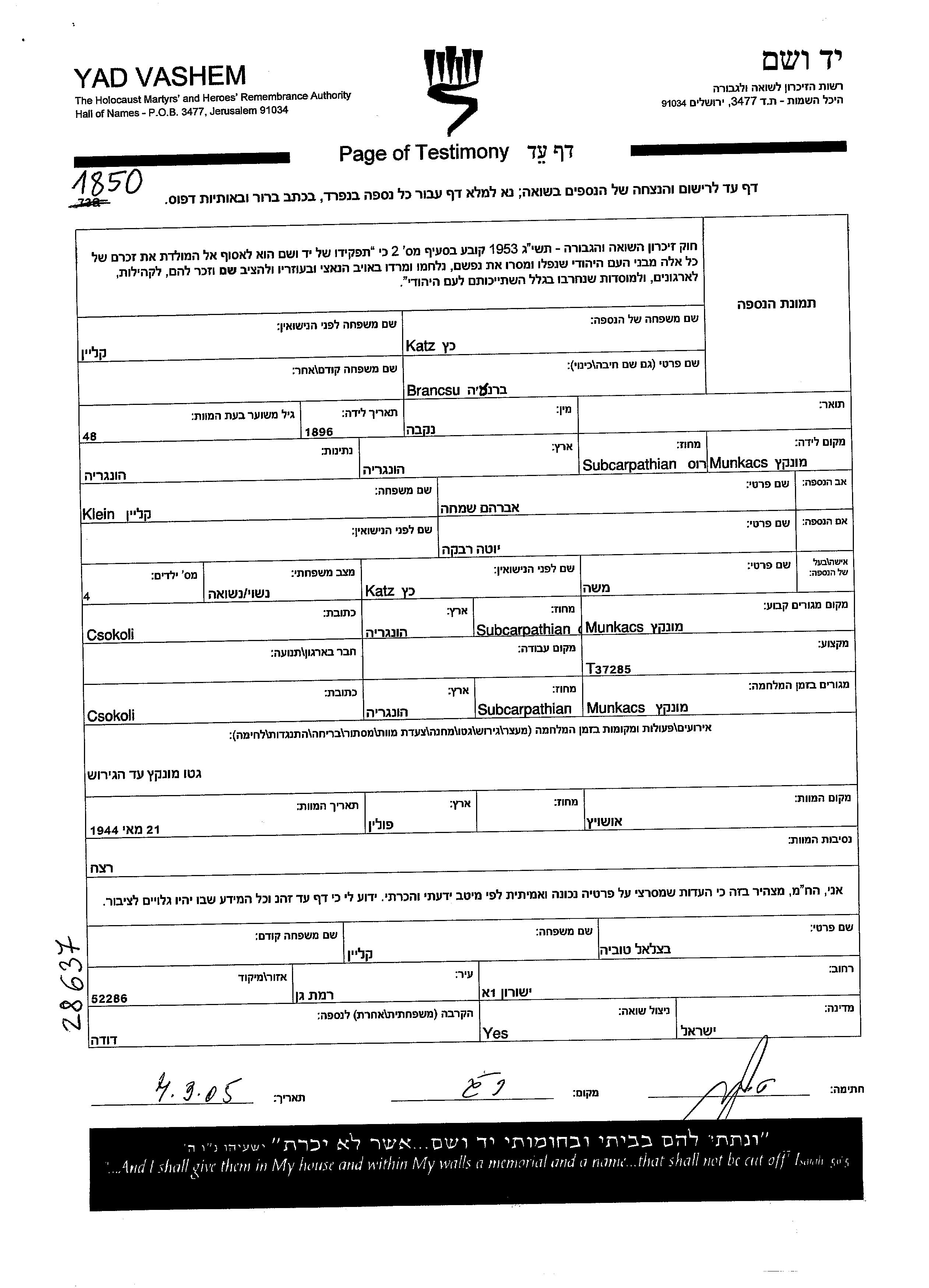 Brancsu כץ לבית קליין נולדה בMukačevo שבצ'כוסלובקיה בשנת 1896 לאברהם שמחה ורבקה יוטה. היא היתה נשואה למשה לבית כץ. לפני מלחמת העולם השניה התגוררה בMukačevo שבצ'כוסלובקיה. בזמן המלחמה היא היתה בMukačevo שבצ'כוסלובקיה. היא נרצחה בשואה. מקום המוות: Auschwitz שבפולין בשנת 21/05/1944.