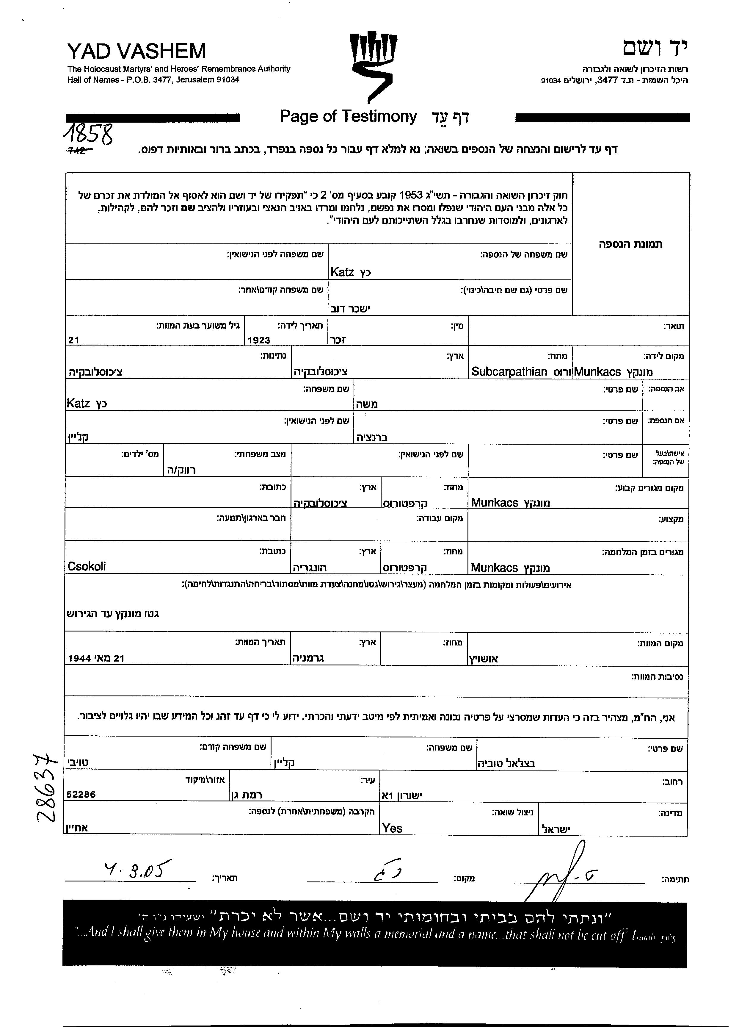 ישכר דוב כץ נולד בMunkacs שבצ'כוסלובקיה בשנת 1923 למשה וברנציה לבית קליין. הוא היה רווק. לפני מלחמת העולם השניה התגורר בMunkacs שבצ'כוסלובקיה. בזמן המלחמה הוא היה בMunkacs שבצ'כוסלובקיה. ישכר דוב נרצח בשואה. מקום המוות: Auschwitz שבפולין בשנת 21/05/1944.