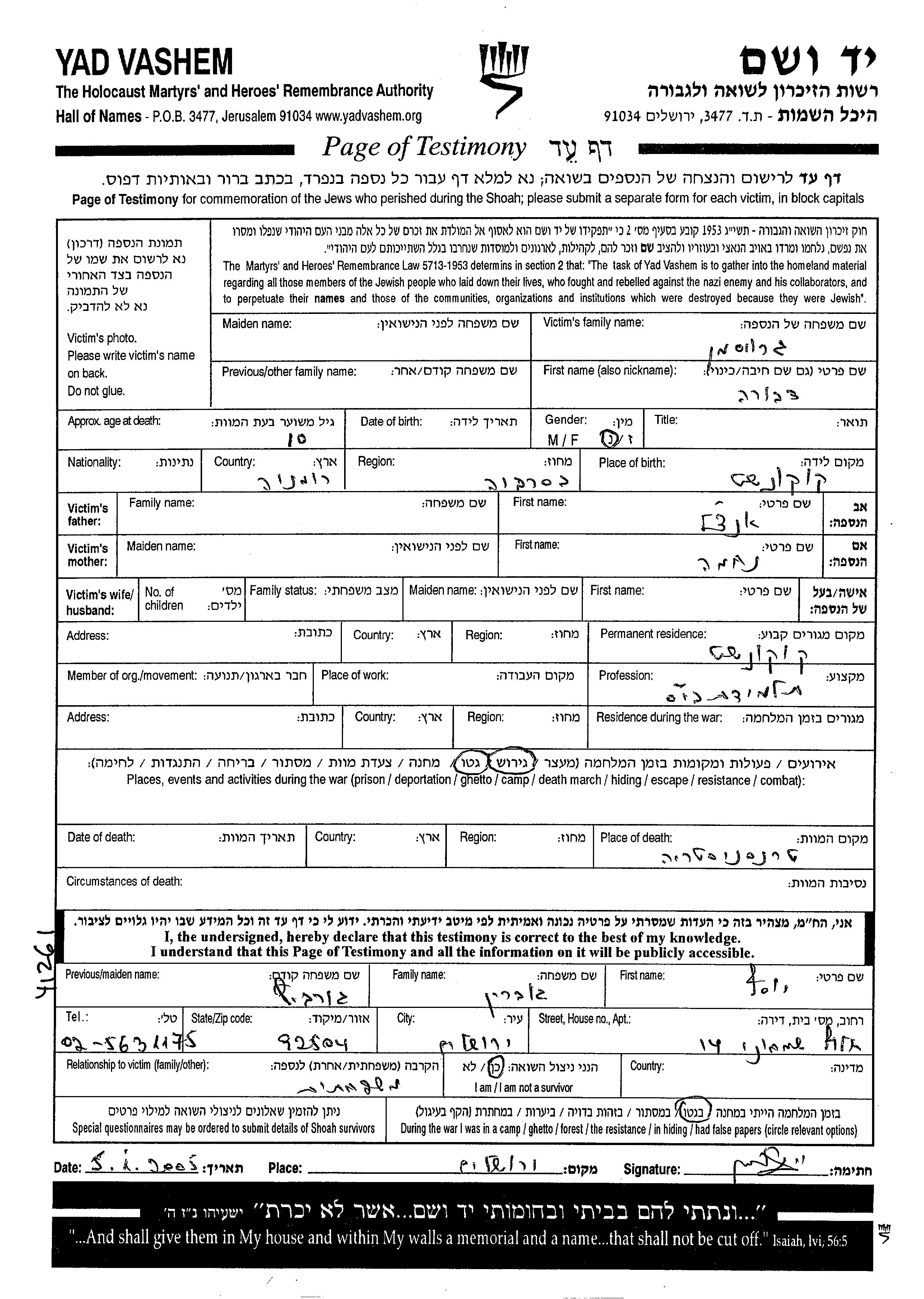 דבורה נרצחה בשואה. מקום המוות: Transnistria שבאוקראינה (ברה"מ).