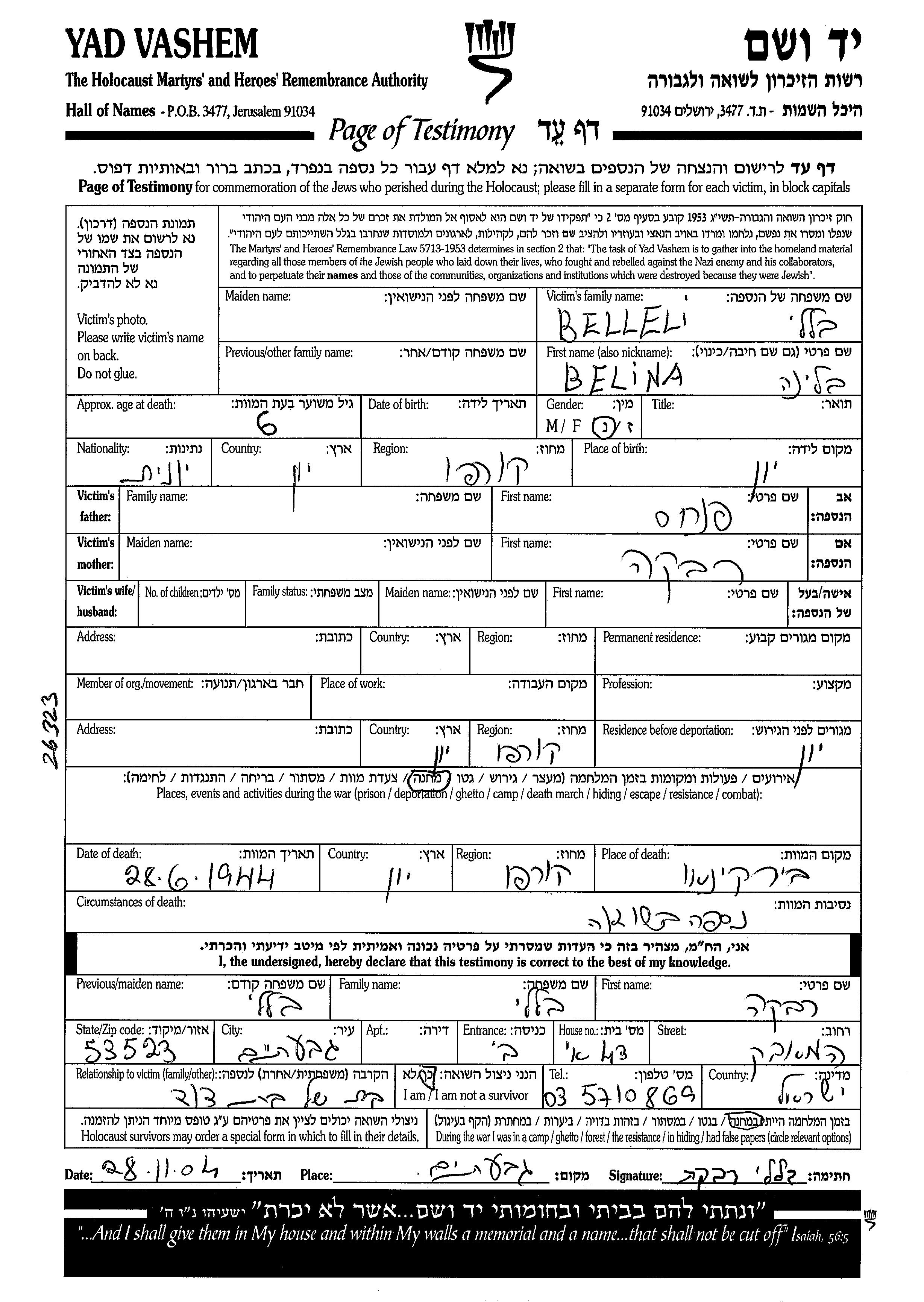 היא נרצחה בשואה. מקום המוות: Birkenau שבפולין בשנת 28/06/1944.