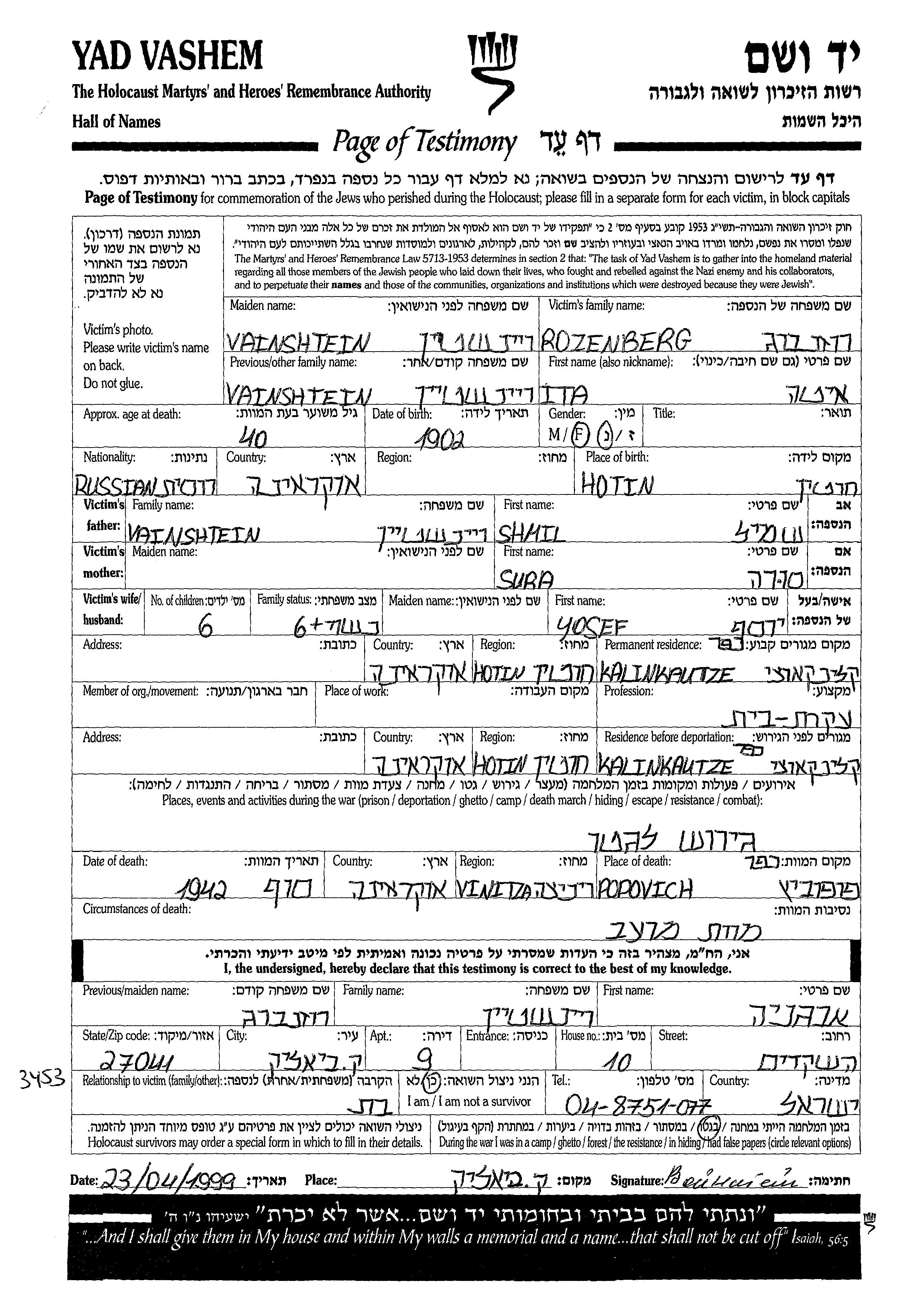 איטה רוזנברג לבית Vainshtein נולדה בHotin שברומניה בשנת 1902 לשמיל וסורה. היא היתה נשואה ליוסף. לפני מלחמת העולם השניה התגוררה בColencauti שברומניה. בזמן המלחמה היא היתה בColencauti שברומניה. איטה נרצחה בשואה. מקום המוות: Popovitz שבאוקראינה (ברה"מ) בשנת 1942.