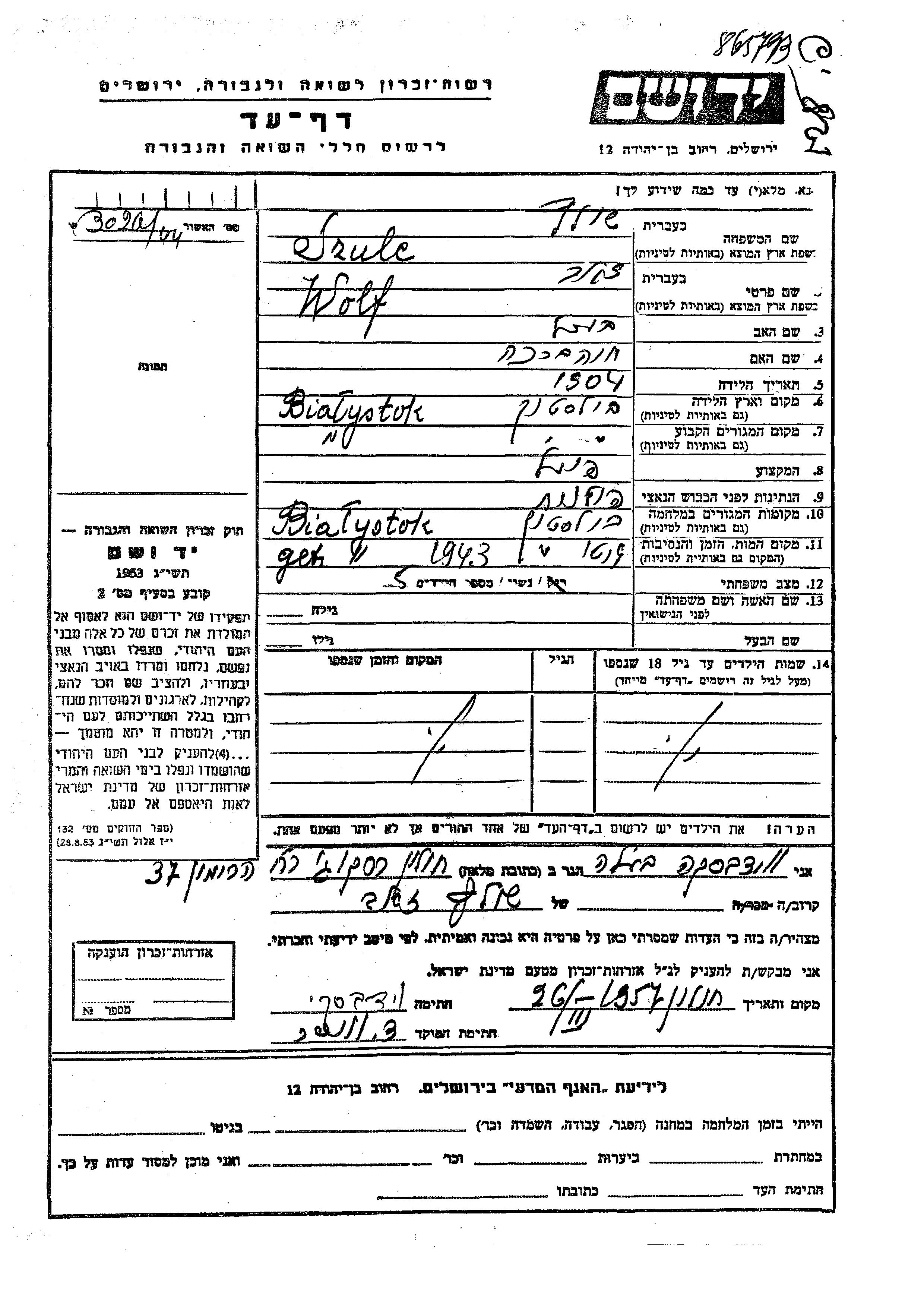 Wolf זאב Szulc נולד בBialystok שבפולין בשנת 1904 לבערל וחוה ברכה. הוא היה פועל ונשוי. לפני מלחמת העולם השניה התגורר בBialystok שבפולין. בזמן המלחמה הוא היה בBialystok שבפולין. הוא נרצח בשואה. מקום המוות: Bialystok שבפולין בשנת 1943.