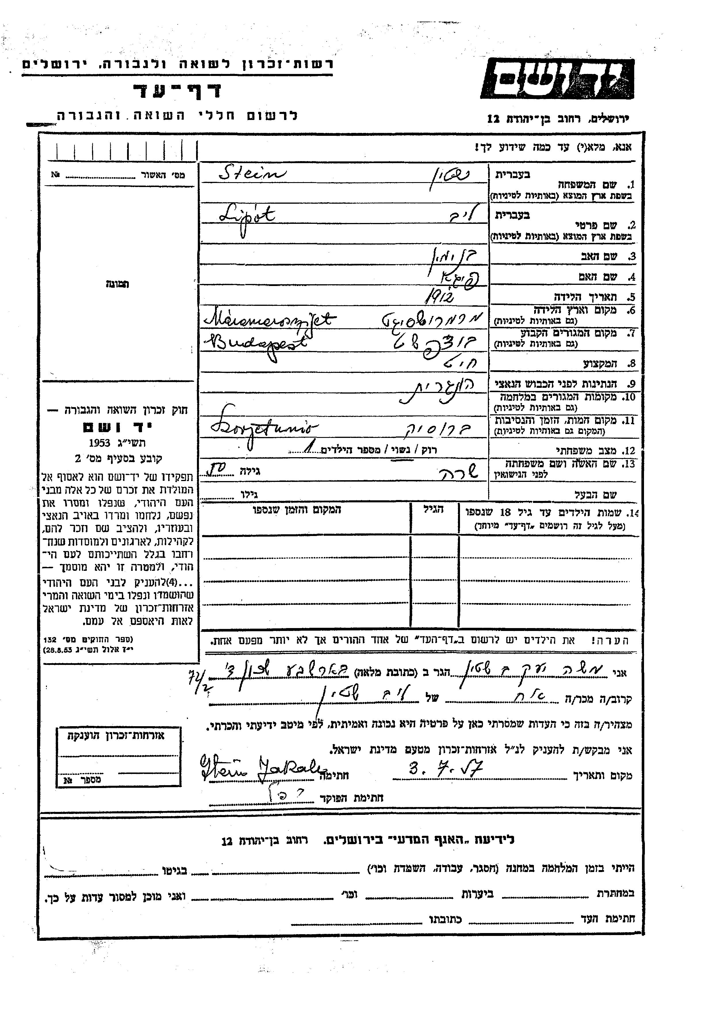 לייב ליפוט Stein נולד בMarmaros Sighet שברומניה בשנת 1912 לבנימין ופיגא. הוא היה חייט ונשוי לשרה. לפני מלחמת העולם השניה התגורר בBudapest שבהונגריה. לייב ליפוט נרצח בשואה. מקום המוות: רוסיה (ברה"מ).