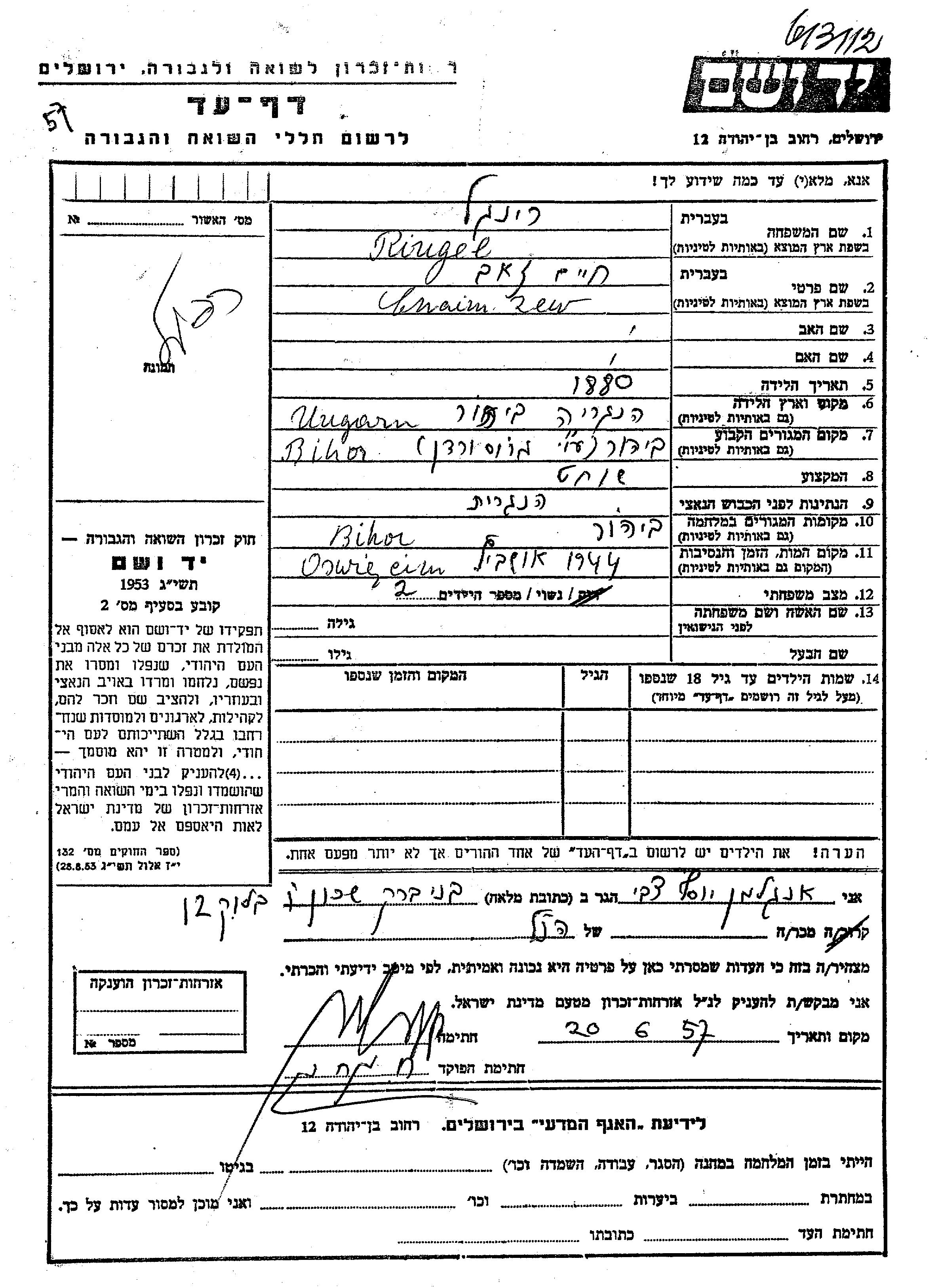 חיים Zew נרצח בשואה. מקום המוות: Auschwitz שבפולין בשנת 1944.