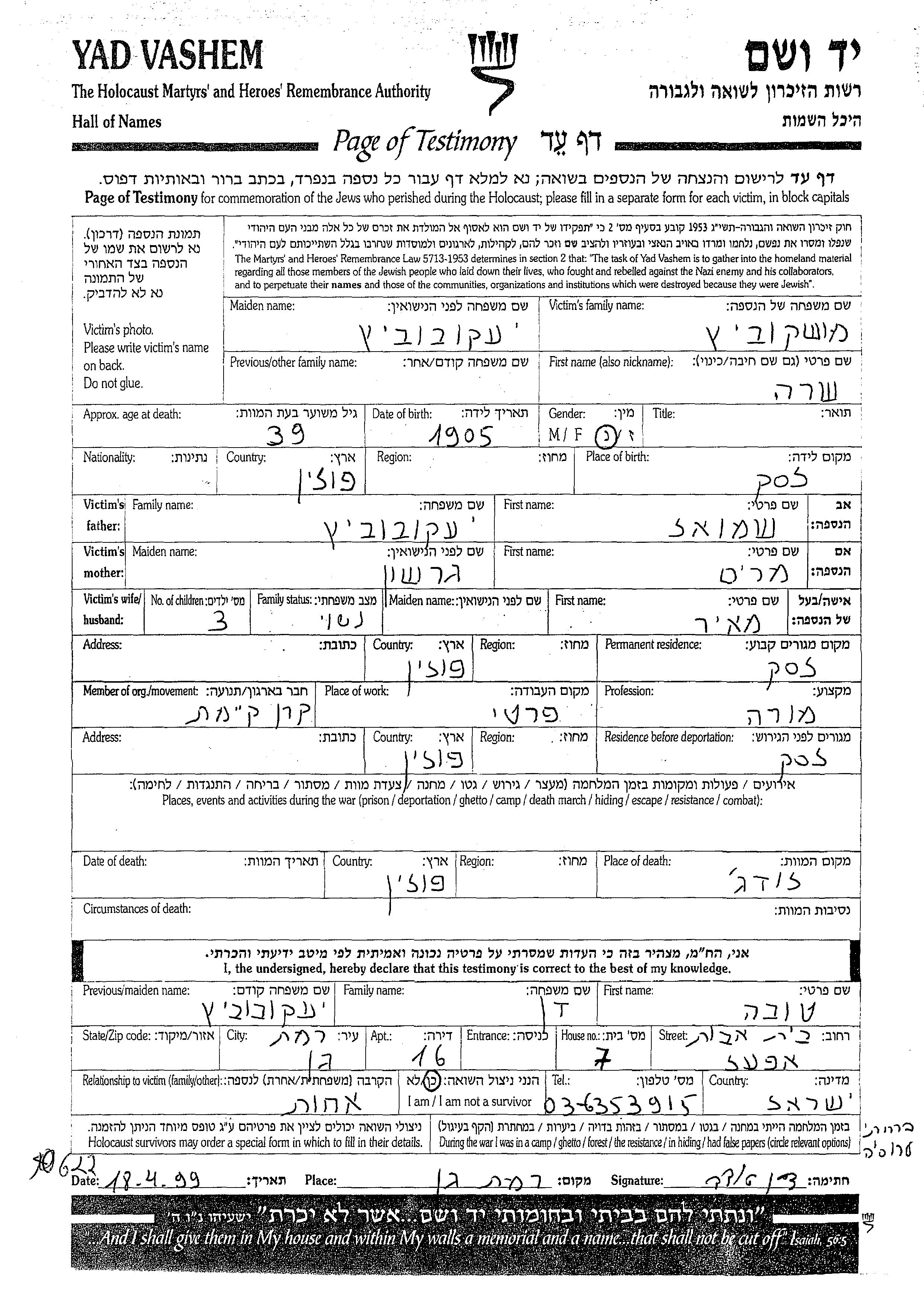 שרה נרצחה בשואה. מקום המוות: Lodz שבפולין.