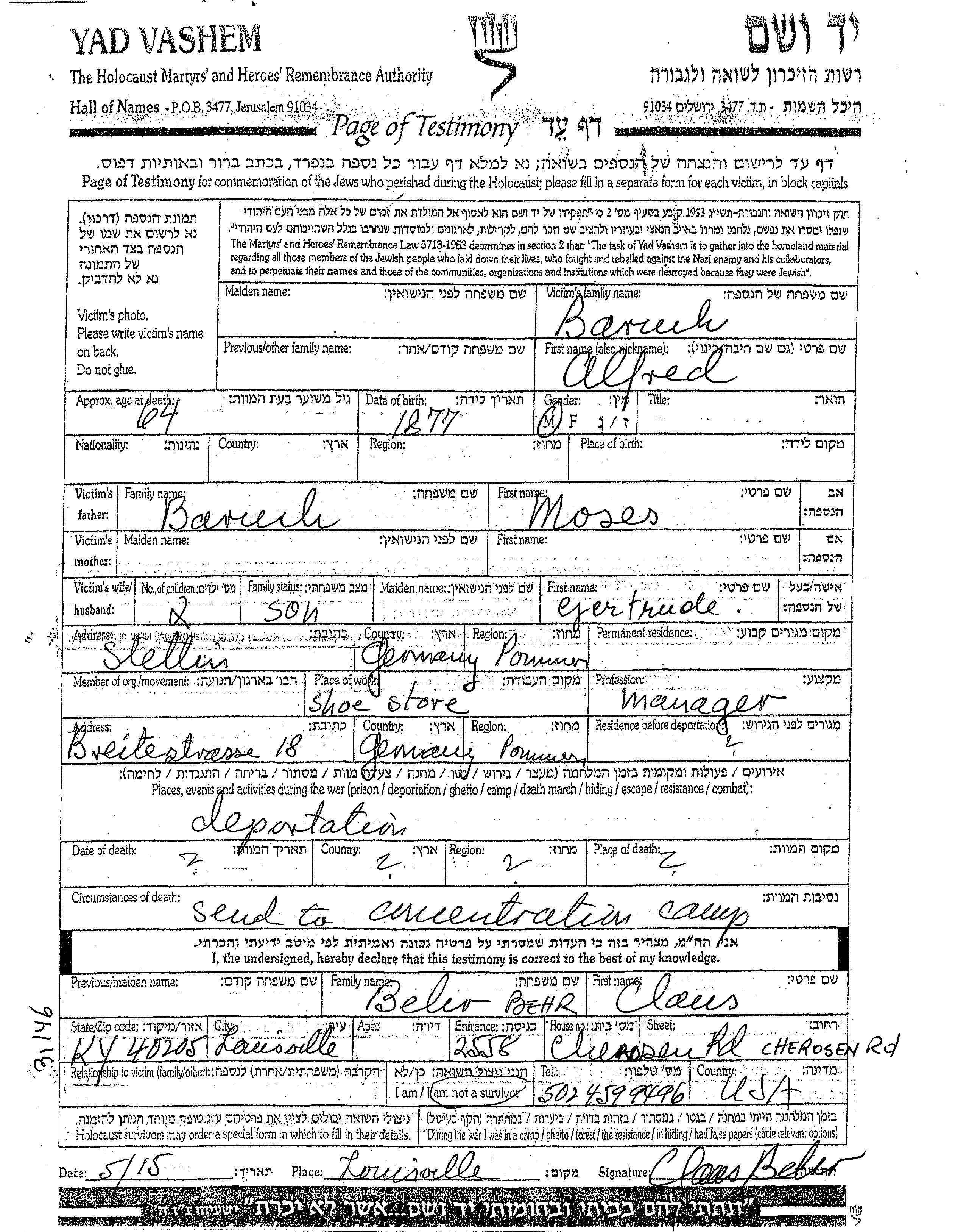 אלפרד Baruch נולד בשנת 1877 לMoses. הוא היה מנהל. לפני מלחמת העולם השניה התגורר ב<> (<>),Pomerania,גרמניה שבגרמניה. בזמן המלחמה הוא היה ב<> (<>),Pomerania,גרמניה שבגרמניה. אלפרד נרצח בשואה. מקום המוות: מחנה,<>.