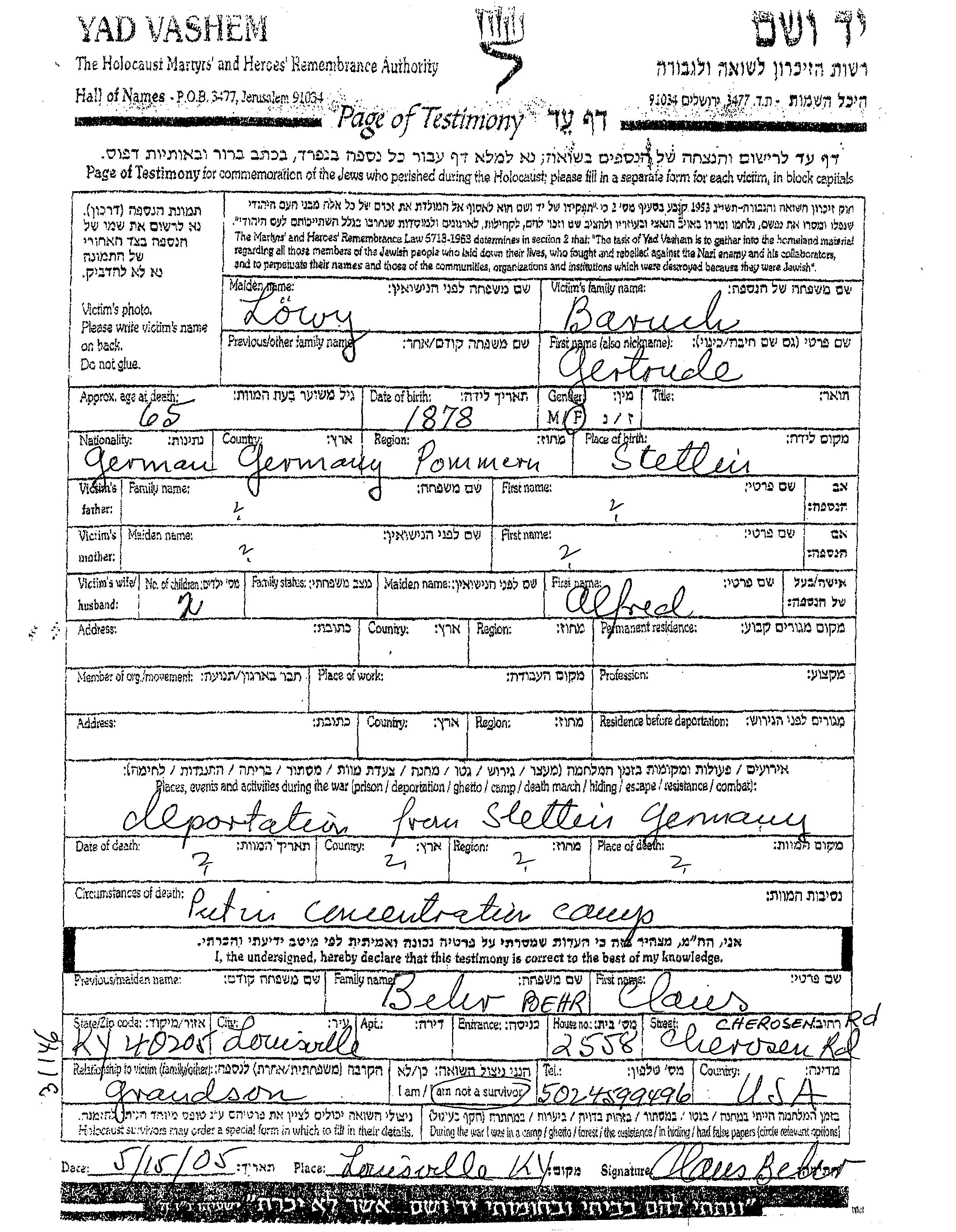 גרטרודה Baruch לבית Lowy נולדה בStettin שבגרמניה בשנת 1878. לפני מלחמת העולם השניה התגוררה במקום לא רשום.