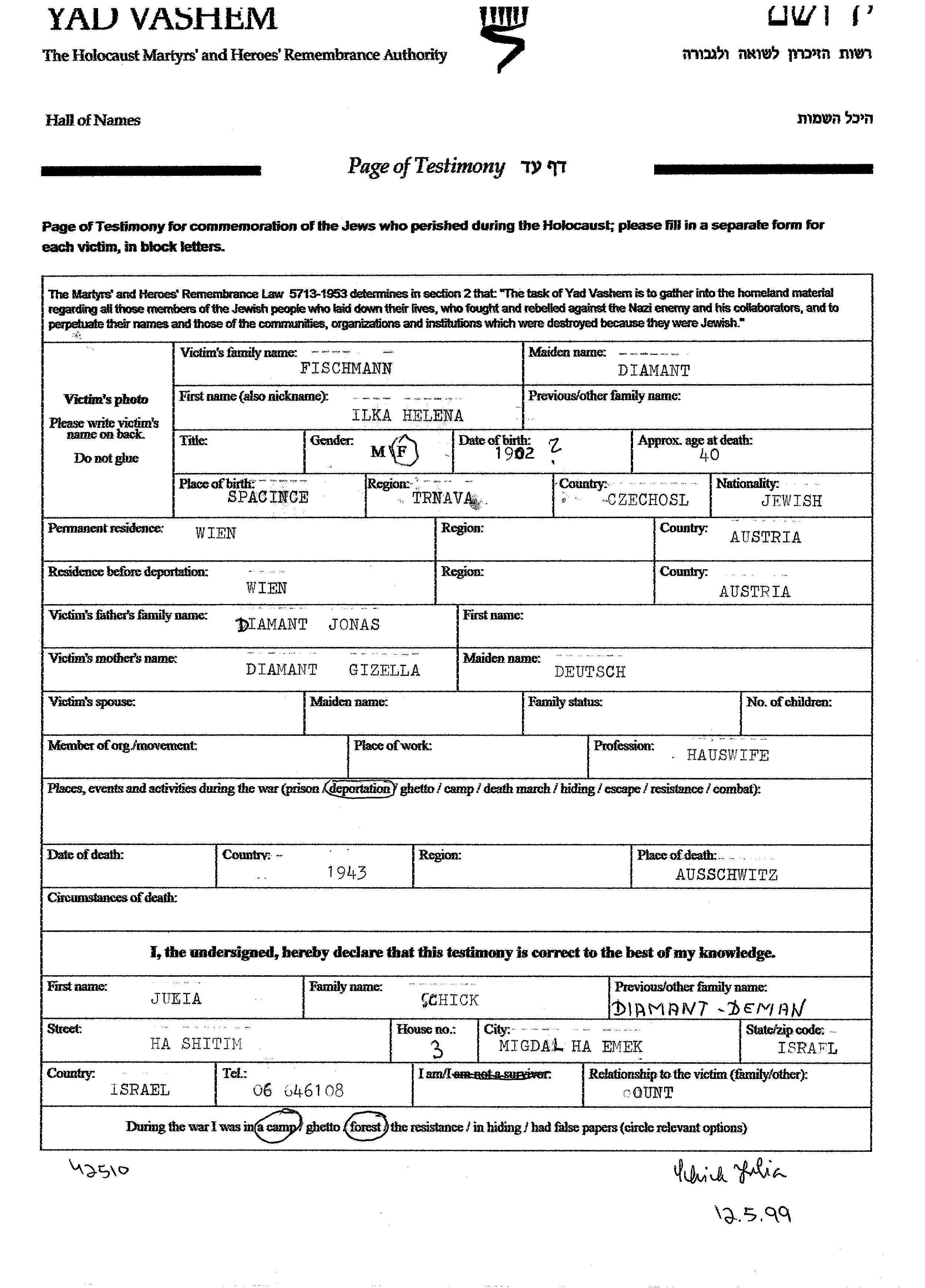 Ilka הלנה Fischmann לבית דיאמנט נולדה בSpacince שבצ'כוסלובקיה בשנת 1902 לJonas וגיזלה לבית Deutsch. היא היתה עקרת בית. לפני מלחמת העולם השניה התגוררה בVienna שבאוסטריה. בזמן המלחמה היא היתה בVienna שבאוסטריה.