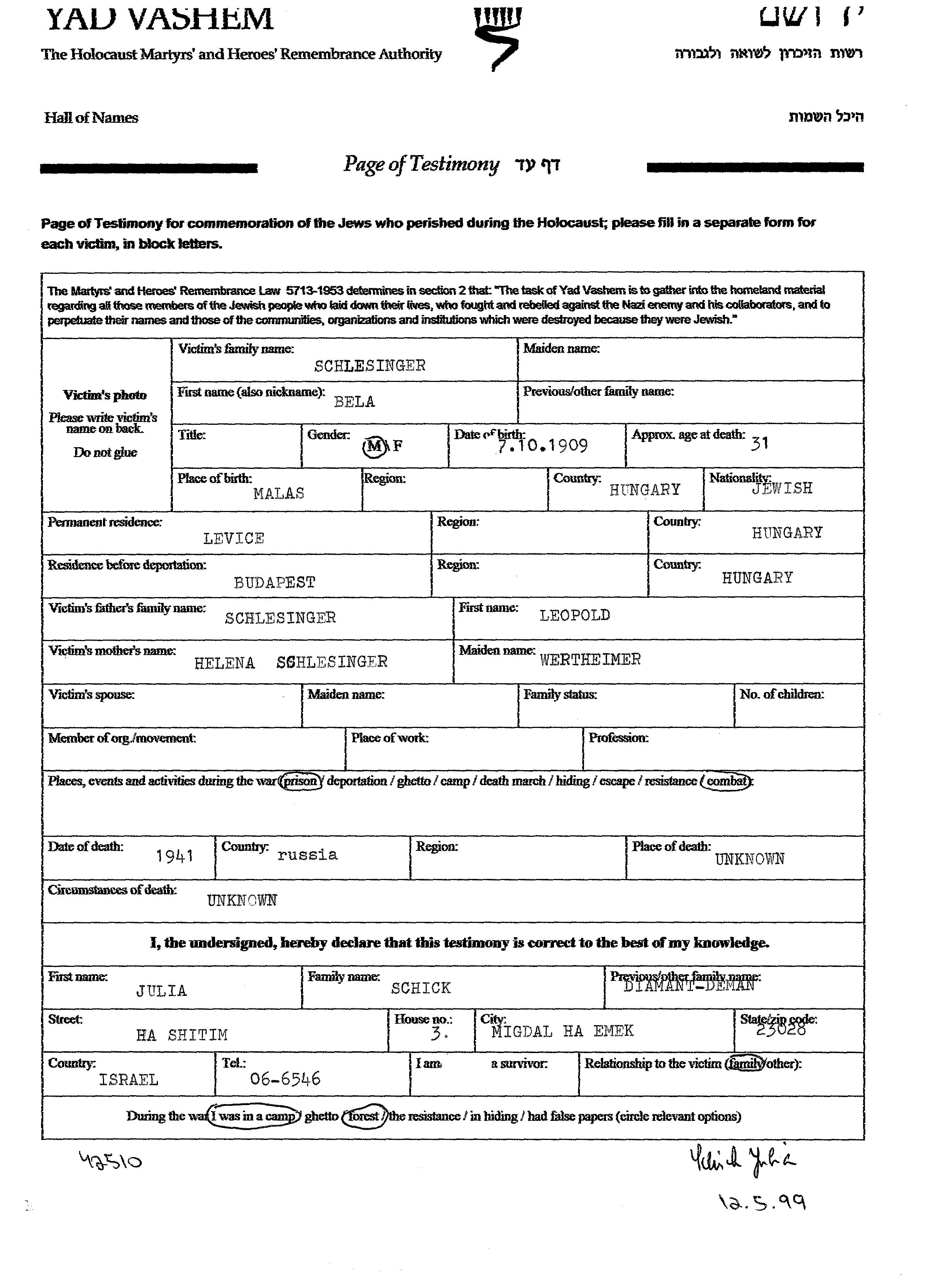 בלה Schlesinger נולד בMalas שבצ'כוסלובקיה בשנת 1909 ללאופולד והלנה לבית Wertheimer. לפני מלחמת העולם השניה התגורר בLevice שבצ'כוסלובקיה. בזמן המלחמה הוא היה בBudapest שבהונגריה. בלה נרצח בשואה. מקום המוות: רוסיה (ברה"מ) בשנת 1941.