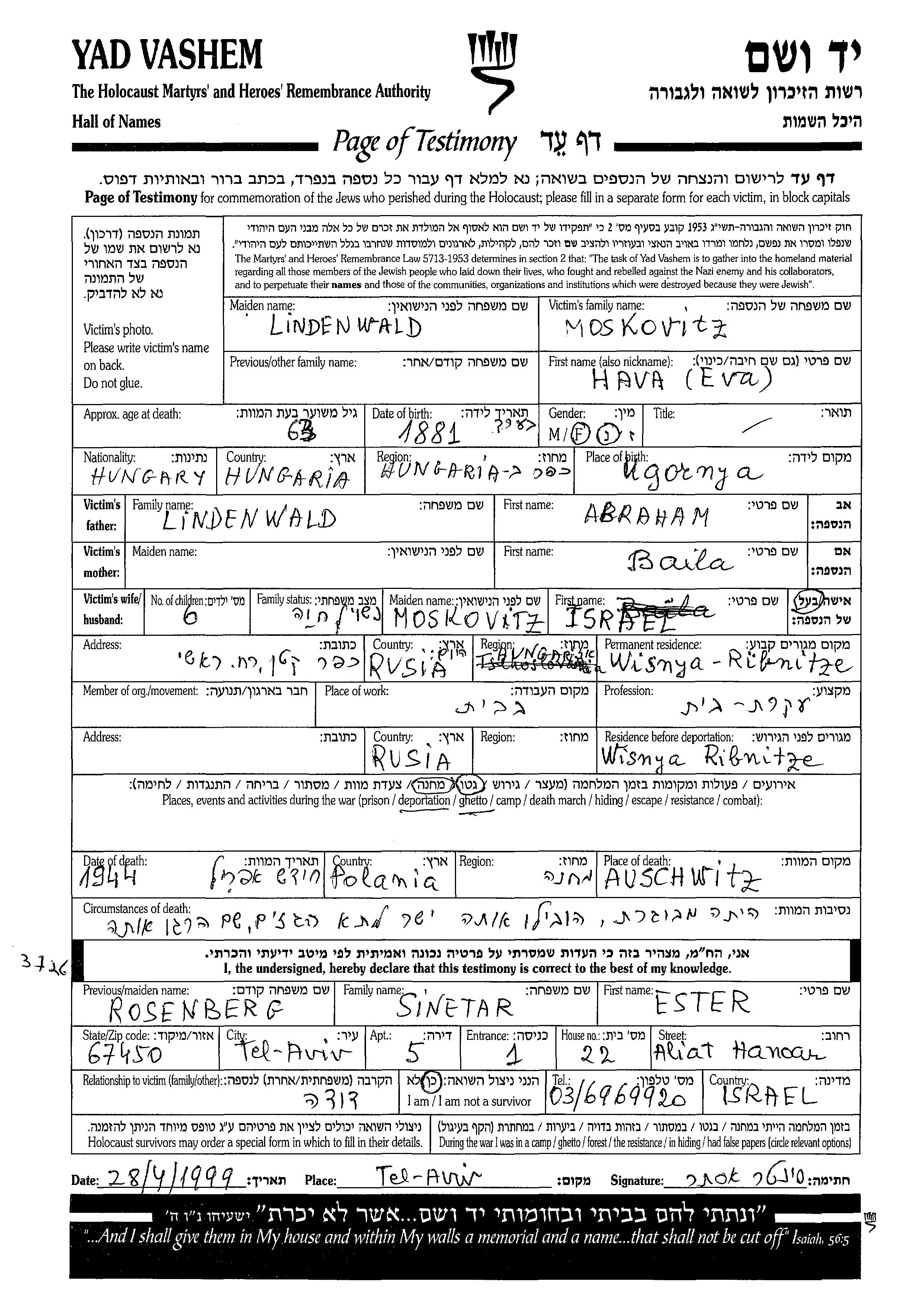 אווה Hava Moskovitz לבית Lindenwald נולדה בUgornya שבהונגריה בשנת 1881 לAbraham וBaila. היא היתה עקרת בית ונשואה לIsrael. לפני מלחמת העולם השניה התגוררה בWisna Radvany שבצ'כוסלובקיה. בזמן המלחמה היא היתה בגטו,<>. אווה Hava נרצחה בשואה. מקום המוות: Auschwitz שבפולין בשנת 04/1944.