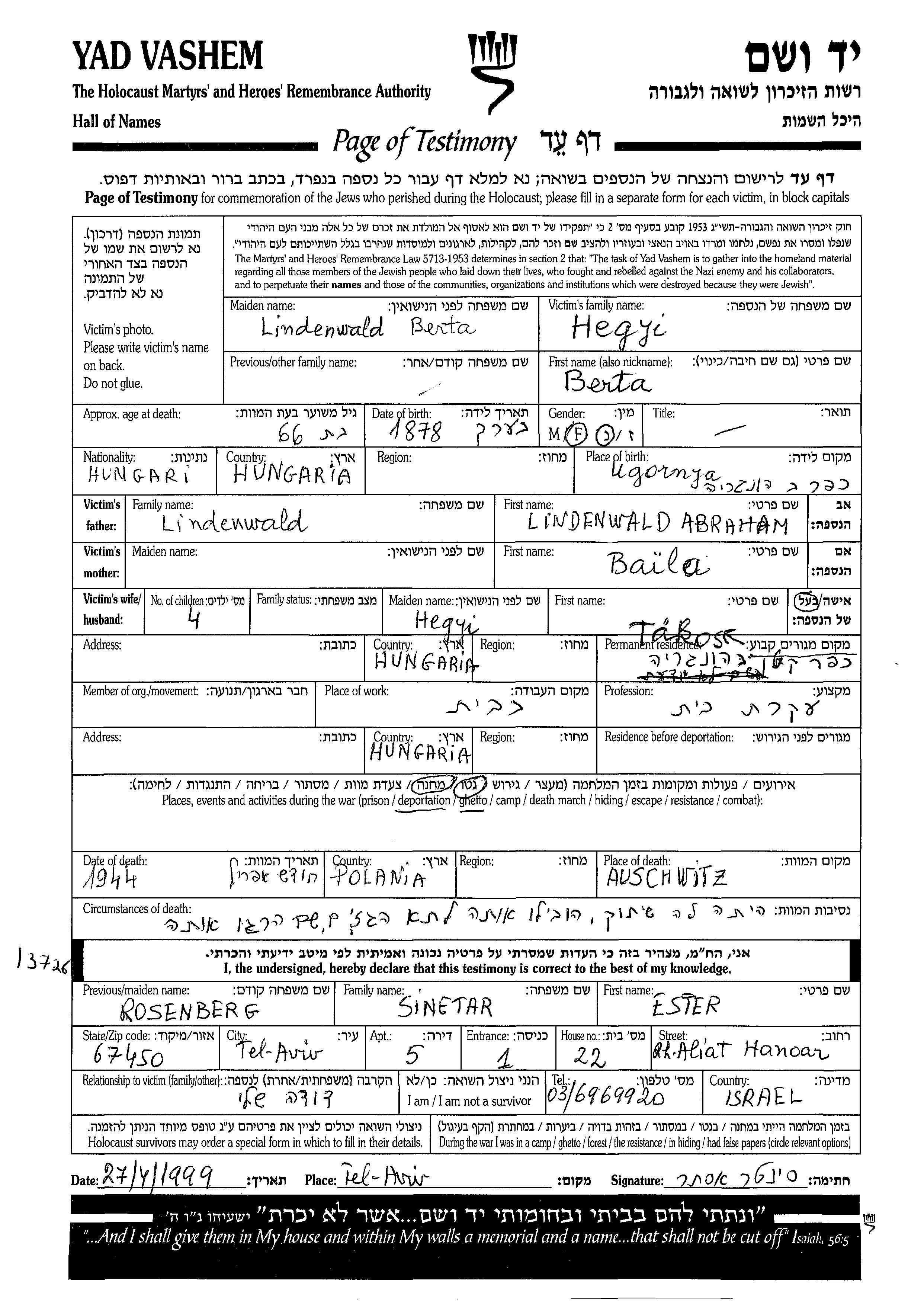 ברטה Hegyi לבית Lindenwald נולדה בUgornya שבהונגריה בשנת 1878 לAbraham וBaila. היא היתה עקרת בית ונשואה. לפני מלחמת העולם השניה התגוררה בTarros שבהונגריה. בזמן המלחמה היא היתה בהונגריה שבהונגריה. ברטה נרצחה בשואה. מקום המוות: Auschwitz שבפולין בשנת 04/1944.