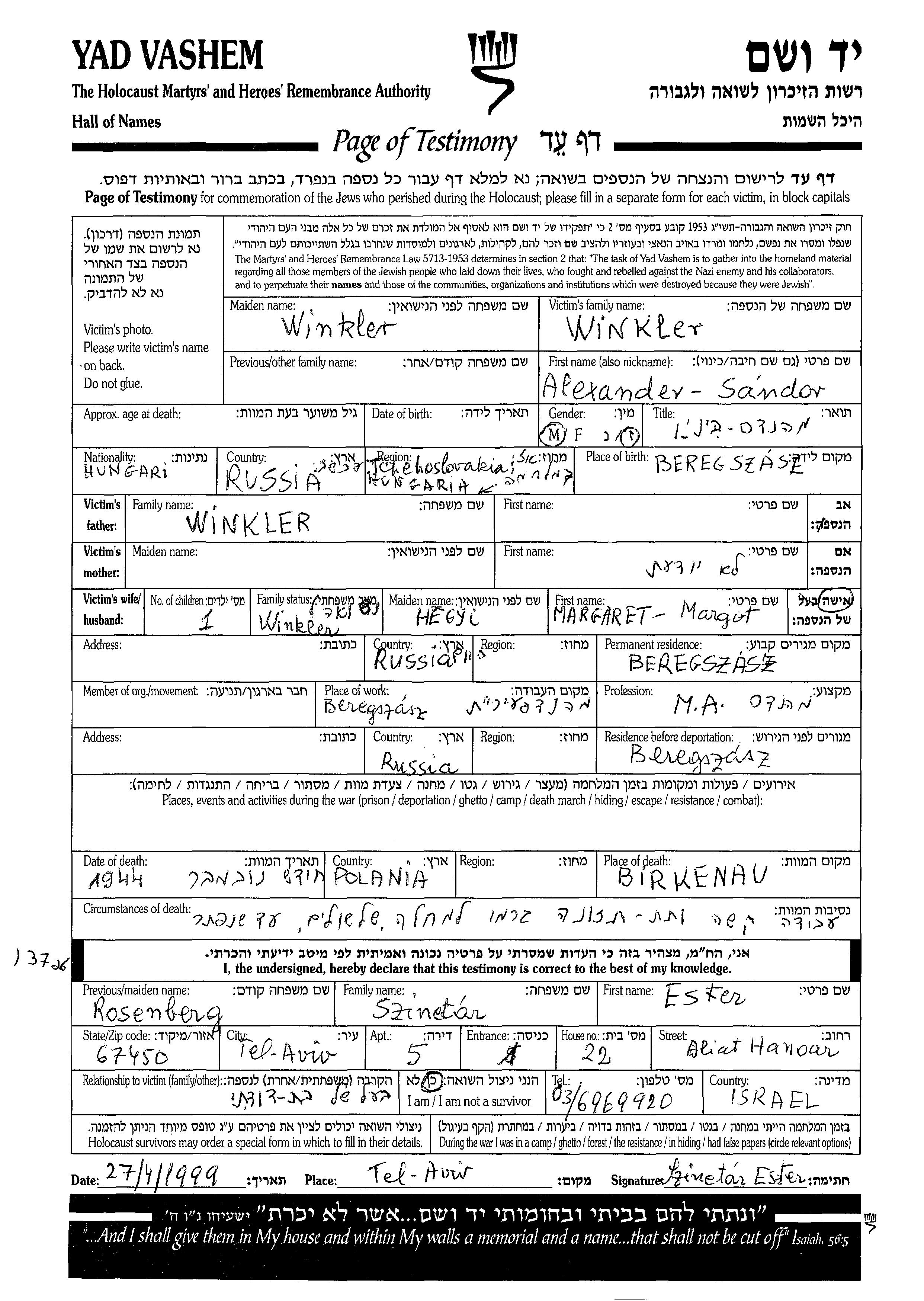 Sandor Winkler נולד בBeregszasz שבצ'כוסלובקיה. הוא היה מהנדס ונשוי לMargit לבית Hegyi. לפני מלחמת העולם השניה התגורר בBeregszasz שבצ'כוסלובקיה. בזמן המלחמה הוא היה בBeregszasz שבצ'כוסלובקיה. הוא נרצח בשואה. מקום המוות: Birkenau שבפולין בשנת 11/1944.