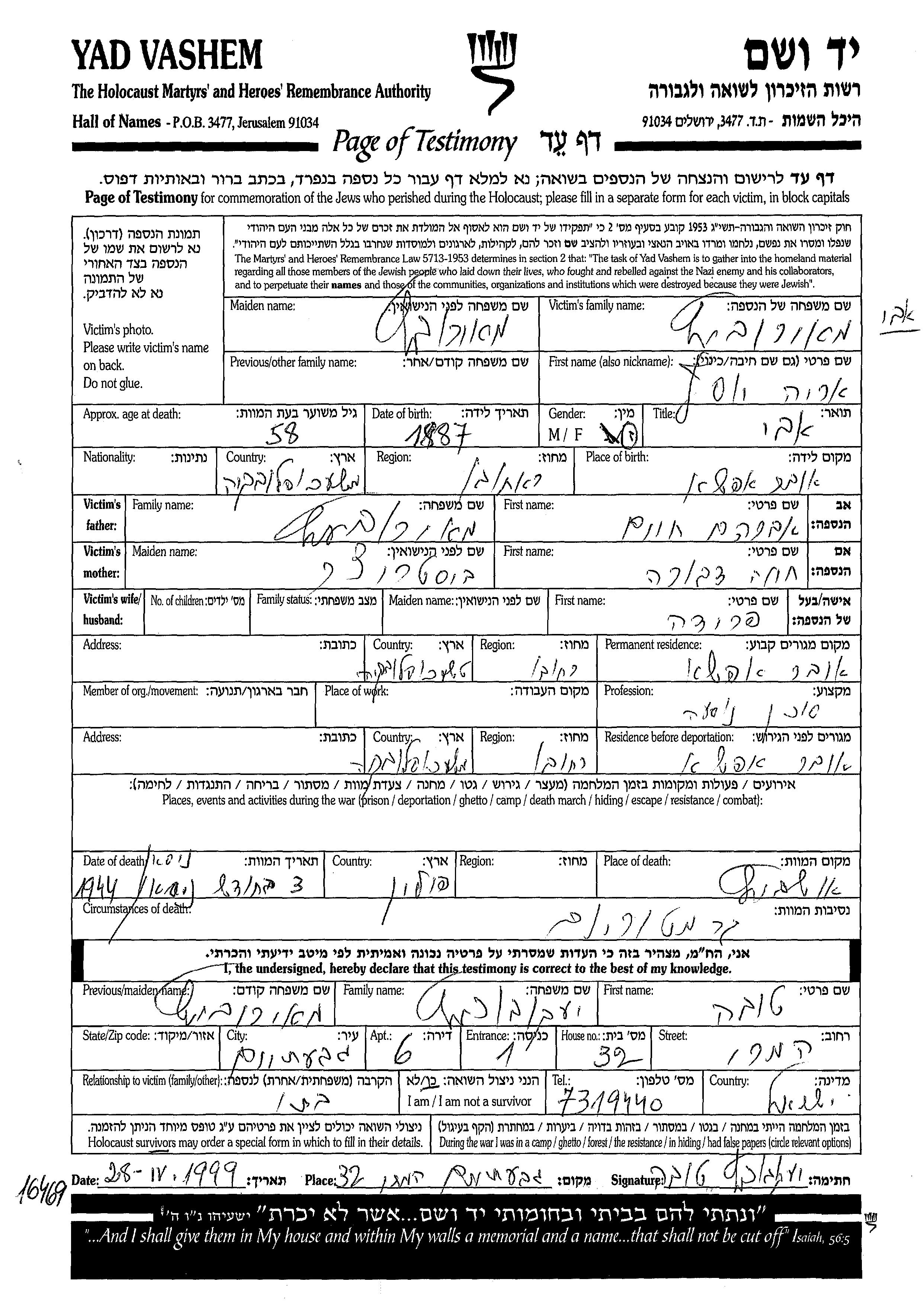 יוסף אריה מאירוביץ נולד בApsa שבצ'כוסלובקיה בשנת 1887 לאברהם חיים וחייה דבורה לבית ביסטריצר. הוא היה סוכן נסיעה ונשוי לפרידה. לפני מלחמת העולם השניה התגורר בApsa שבצ'כוסלובקיה. בזמן המלחמה הוא היה בApsa שבצ'כוסלובקיה. יוסף אריה נרצח בשואה. מקום המוות: Auschwitz שבפולין בשנת 27/03/1944.