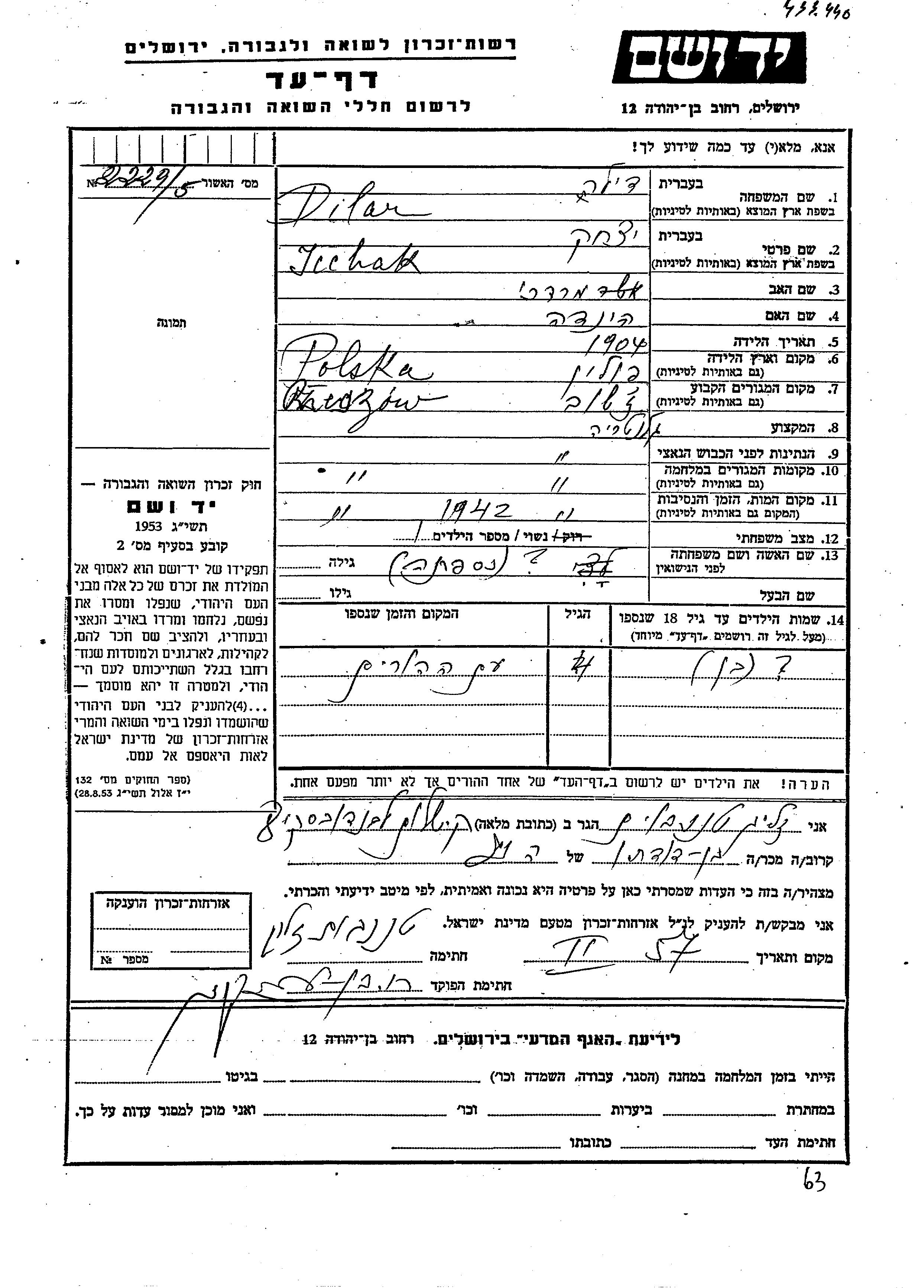 דילר יצחק 1904 Zasov, פולין דף-עד