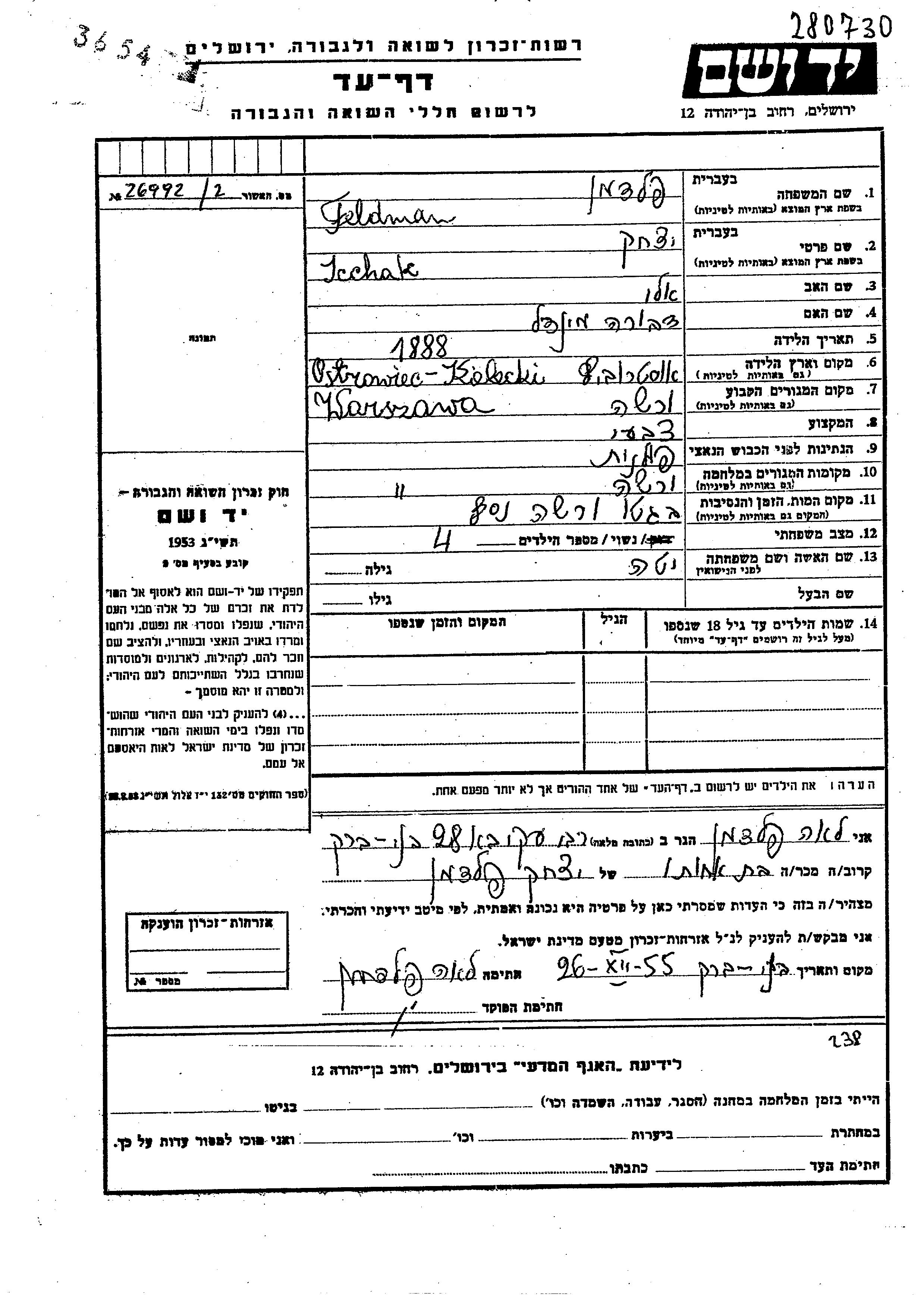 יצחק פלדמן נולד בOstrowiec Kielecki שבפולין בשנת 1888 לאלו ודבורה מינדל. הוא היה צבע ונשוי ליטה. לפני מלחמת העולם השניה התגורר בVarsha שבפולין. בזמן המלחמה הוא היה בVarsha שבפולין. יצחק נרצח בשואה. מקום המוות: Warszawa שבפולין.