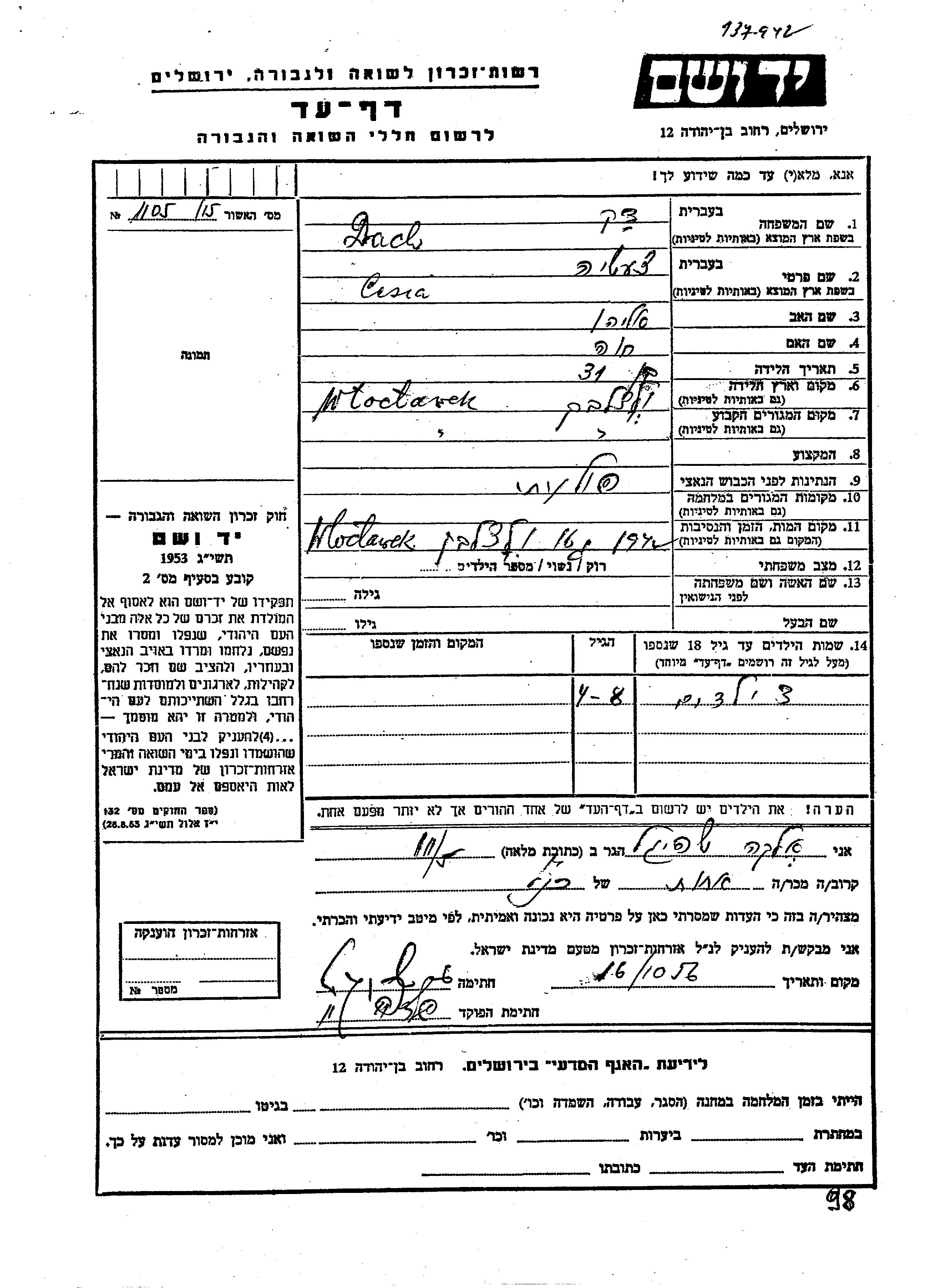 יד ושם - המפעל להנצחת השמות בדפי עד