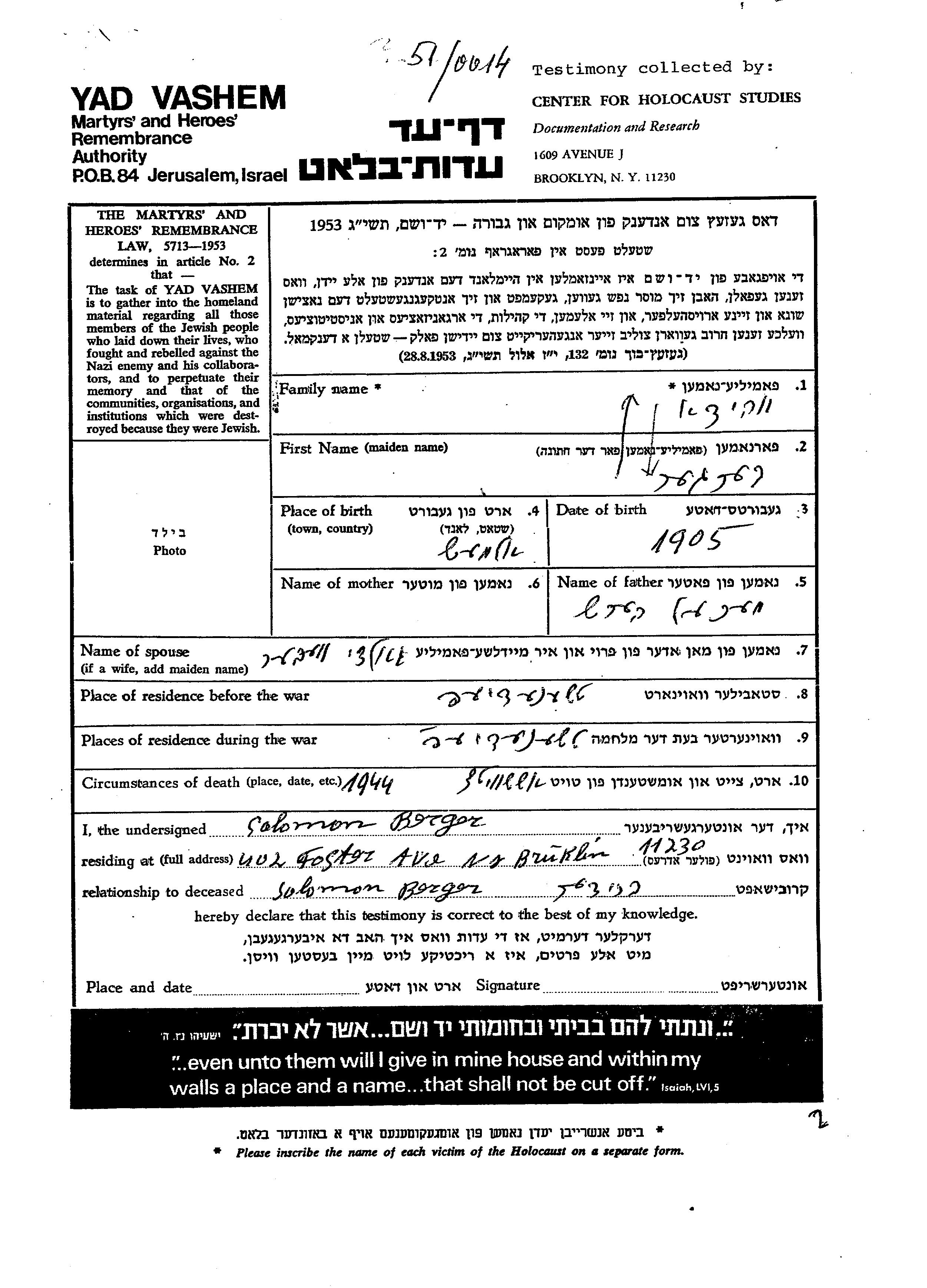יהודא בערגער נולד בAlmas שבהונגריה בשנת 1905 להערש מעכעל. הוא היה נשוי לגאלדי לבית וועבער. לפני מלחמת העולם השניה התגורר בCsenedier שבצ'כוסלובקיה. בזמן המלחמה הוא היה בCsenedier שבצ'כוסלובקיה. יהודא נרצח בשואה. מקום המוות: Auschwitz שבפולין בשנת 1944.