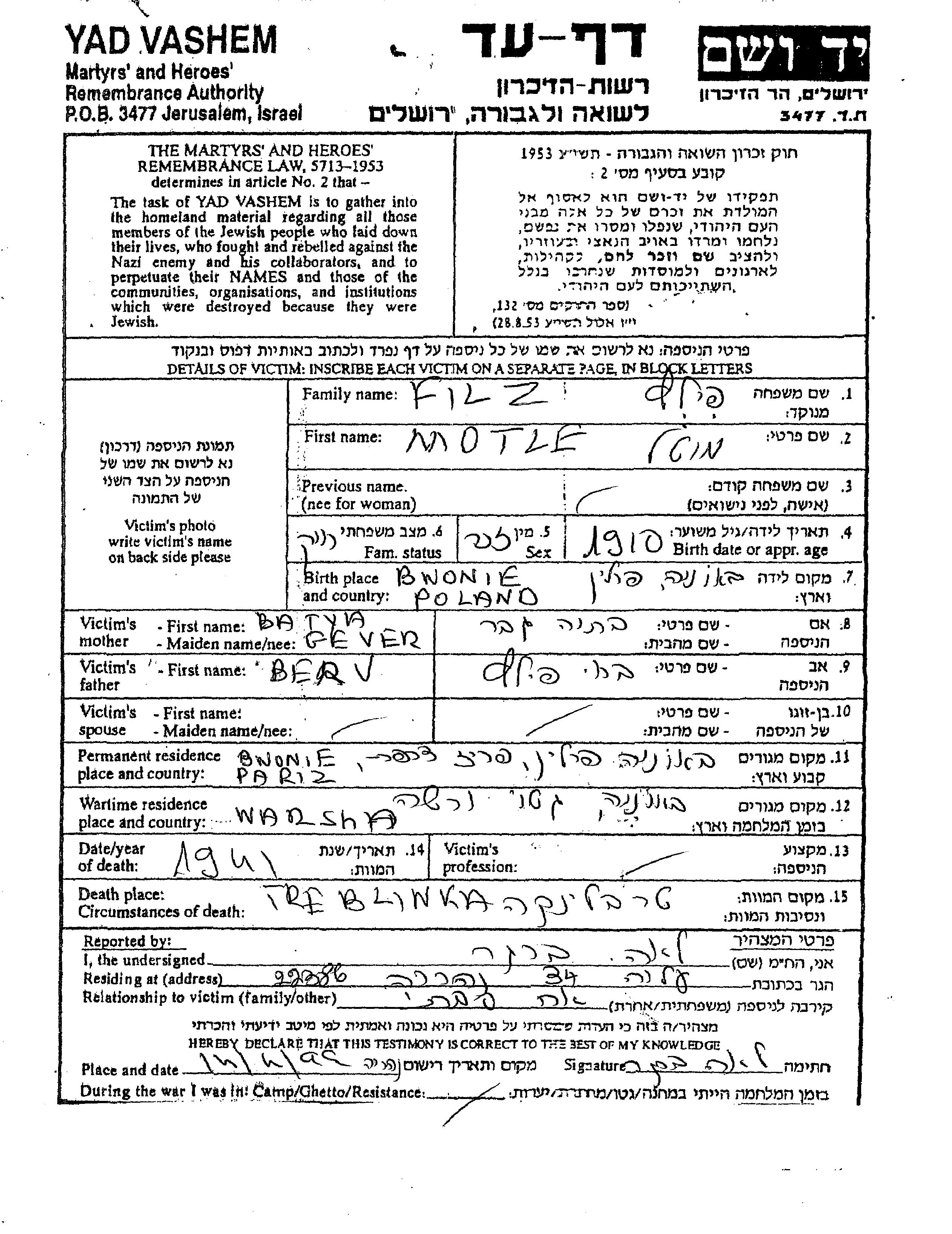 מוטל נרצח בשואה. מקום המוות: Treblinka שבפולין בשנת 1941.