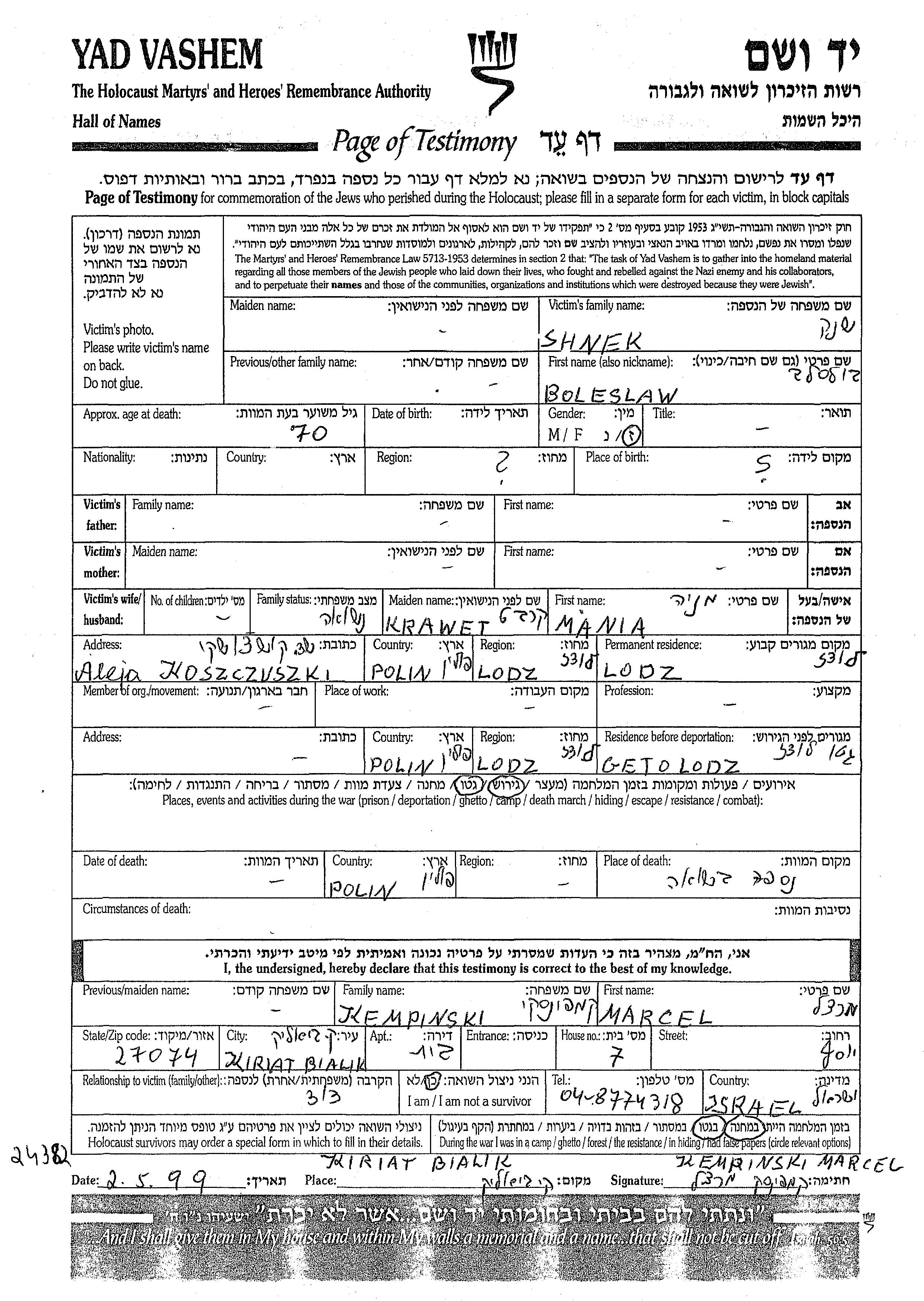 Boleslaw שנק. הוא היה נשוי למניה לבית קרבט Krawet. לפני מלחמת העולם השניה התגורר בLodz שבפולין. בזמן המלחמה הוא היה בLodz שבפולין.