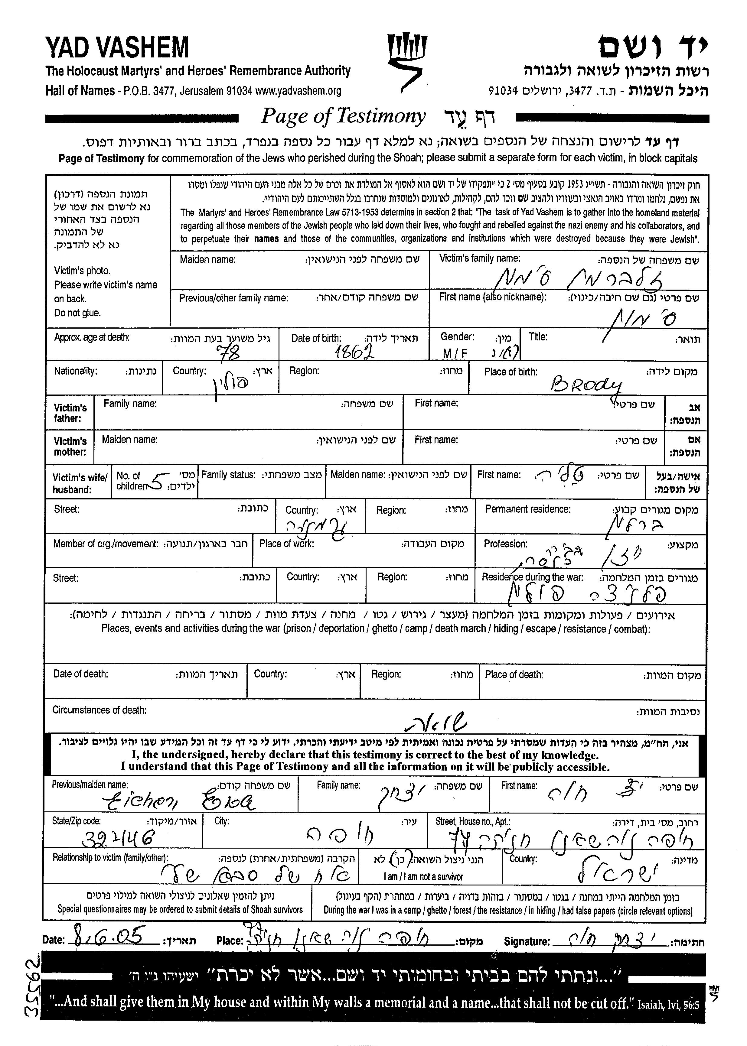 סימון זלברמן נולד בBrody שבפולין בשנת 1862. הוא היה חזן ונשוי לטליה. לפני מלחמת העולם השניה התגורר בBerlin שבגרמניה. בזמן המלחמה הוא היה בPalenice שבפולין. סימון נרצח בשואה.