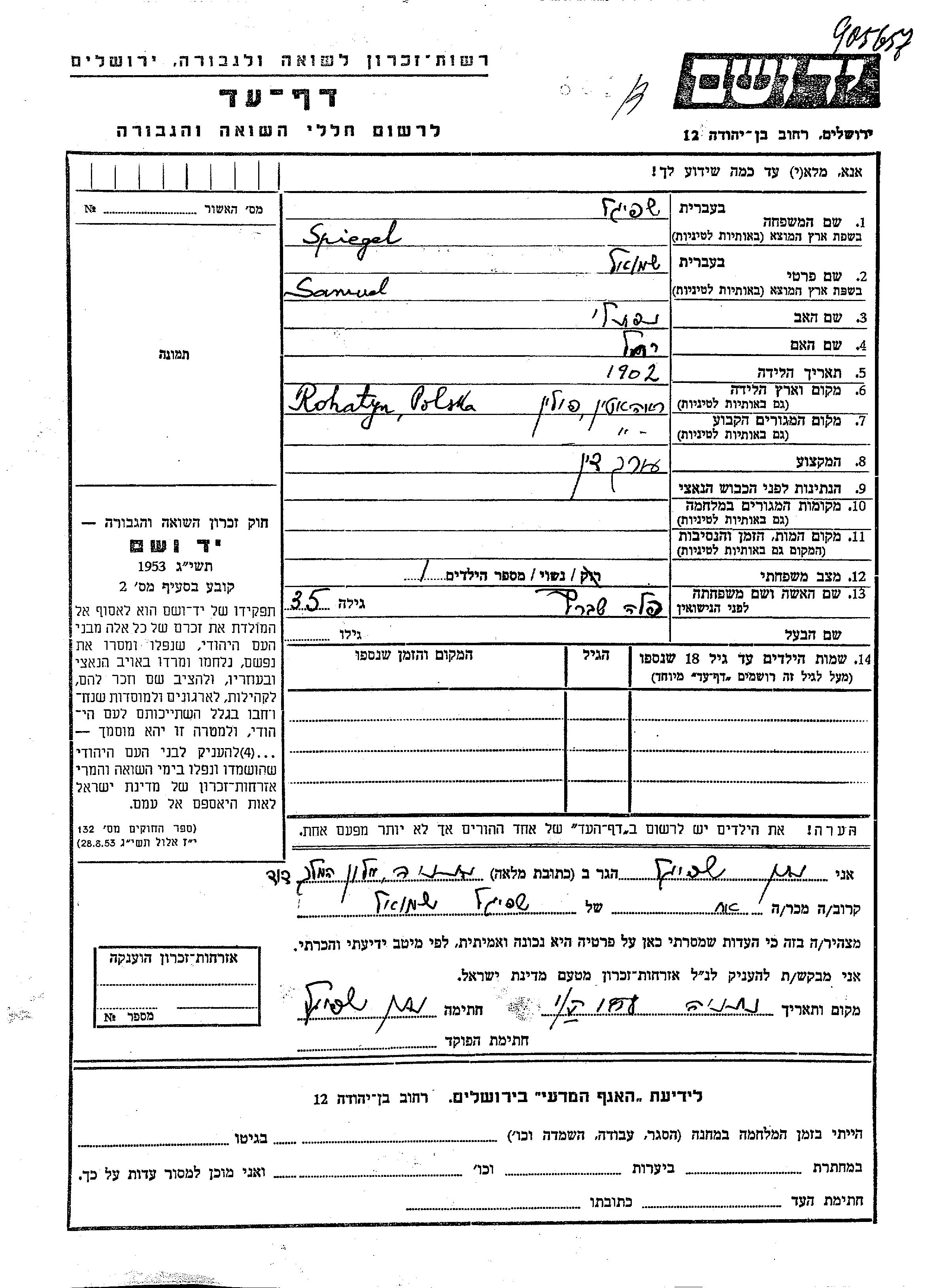 Spiegel שמואל 1902 Rohatyn, פולין דף-עד