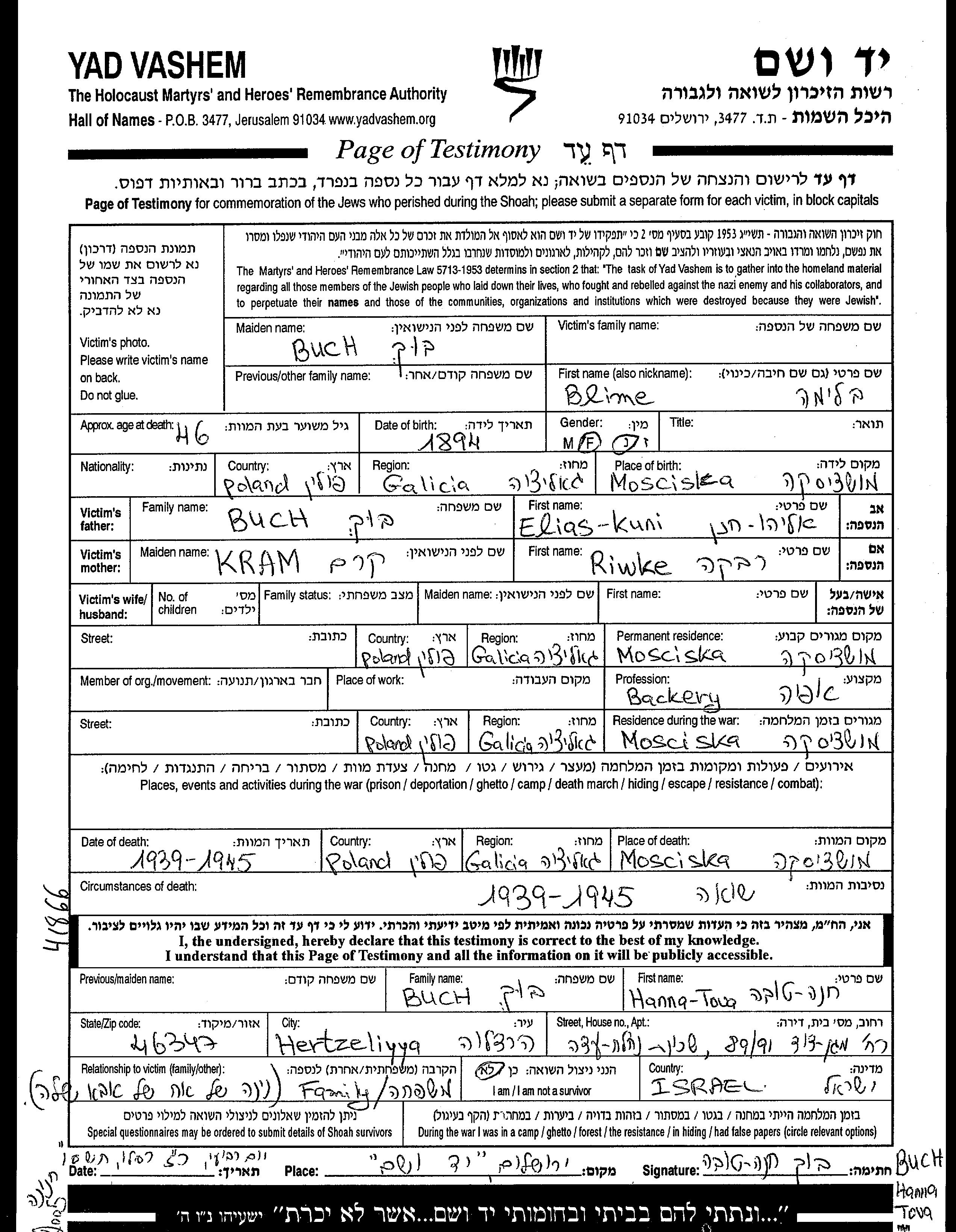 היא נרצחה בשואה. מקום המוות: Mosciska שבפולין.