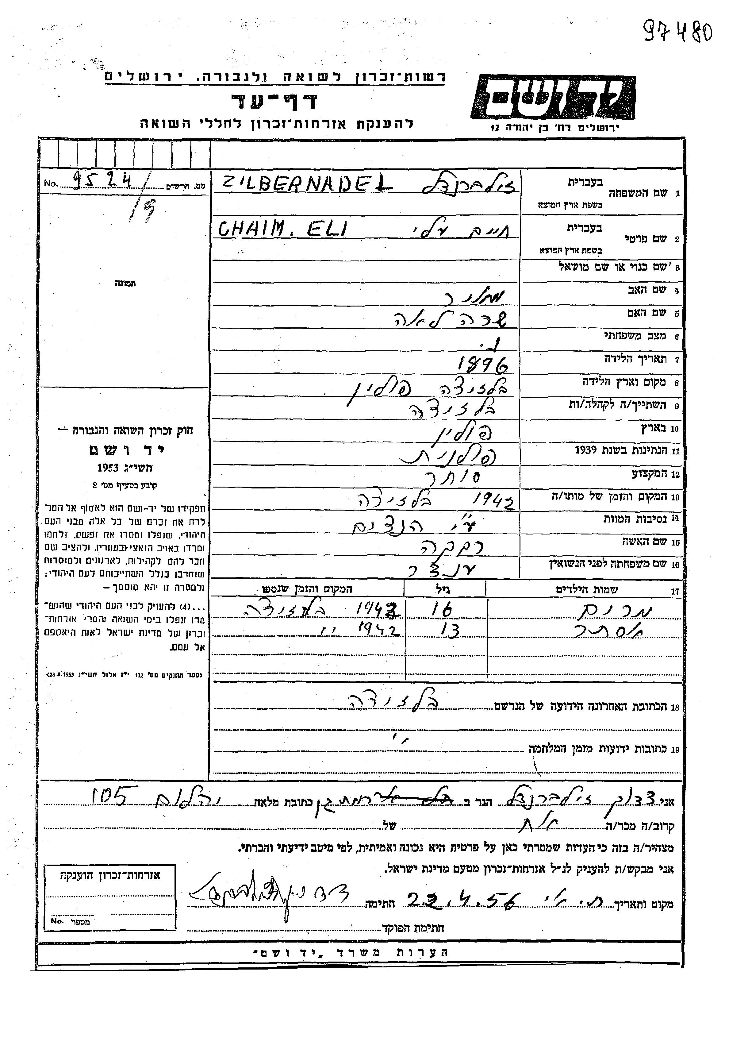 חיים אלי עלי זילברנדל נולד בBelzyce שבפולין בשנת 1896 למאיר ושרה לאה. הוא היה סוחר ונשוי לרבקה לבית ענדר. לפני מלחמת העולם השניה התגורר בBelzyce שבפולין. בזמן המלחמה הוא היה בBelzyce שבפולין. חיים אלי עלי נרצח בשואה. מקום המוות: Belzyce שבפולין בשנת 1942.