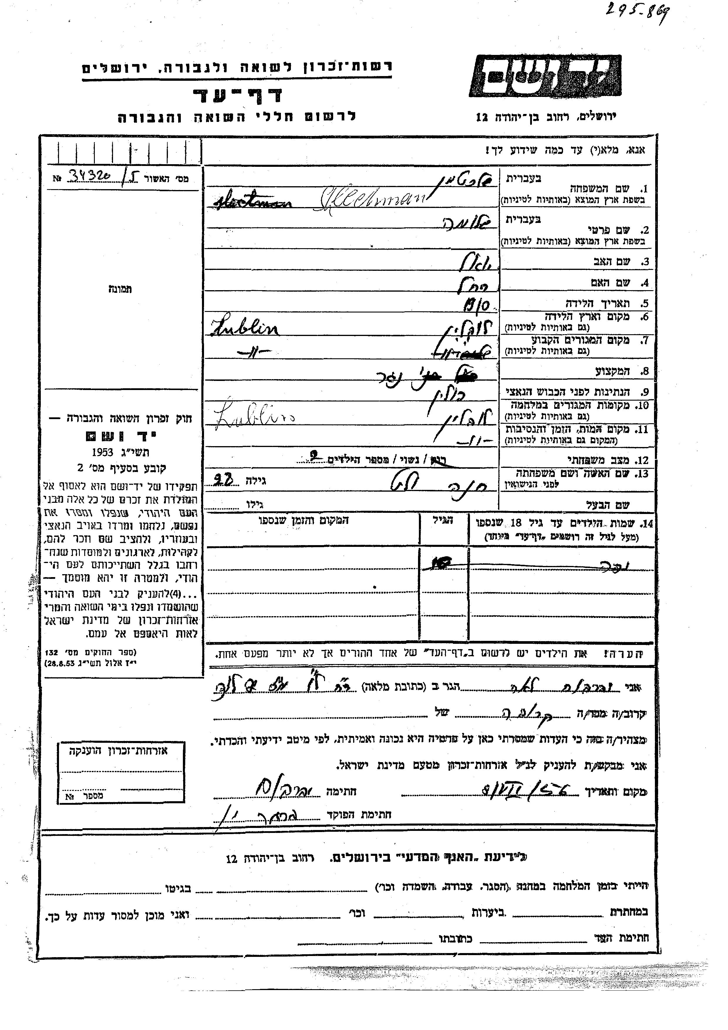 Shlechman שלכטמן שלומה 1910 Lublin, פולין דף-עד