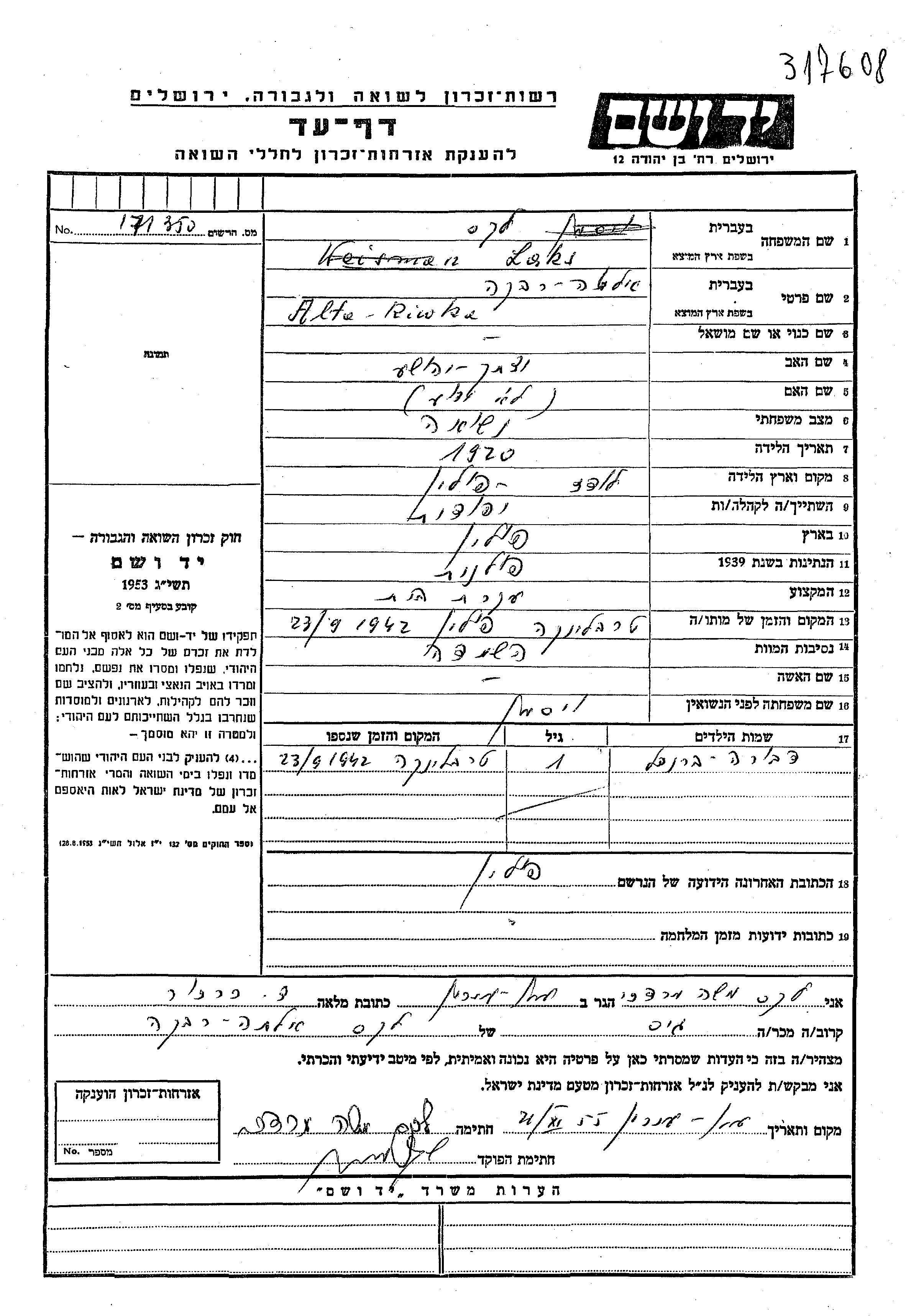 היא נרצחה בשואה. מקום המוות: Treblinka שבפולין בשנת 23/09/1942.