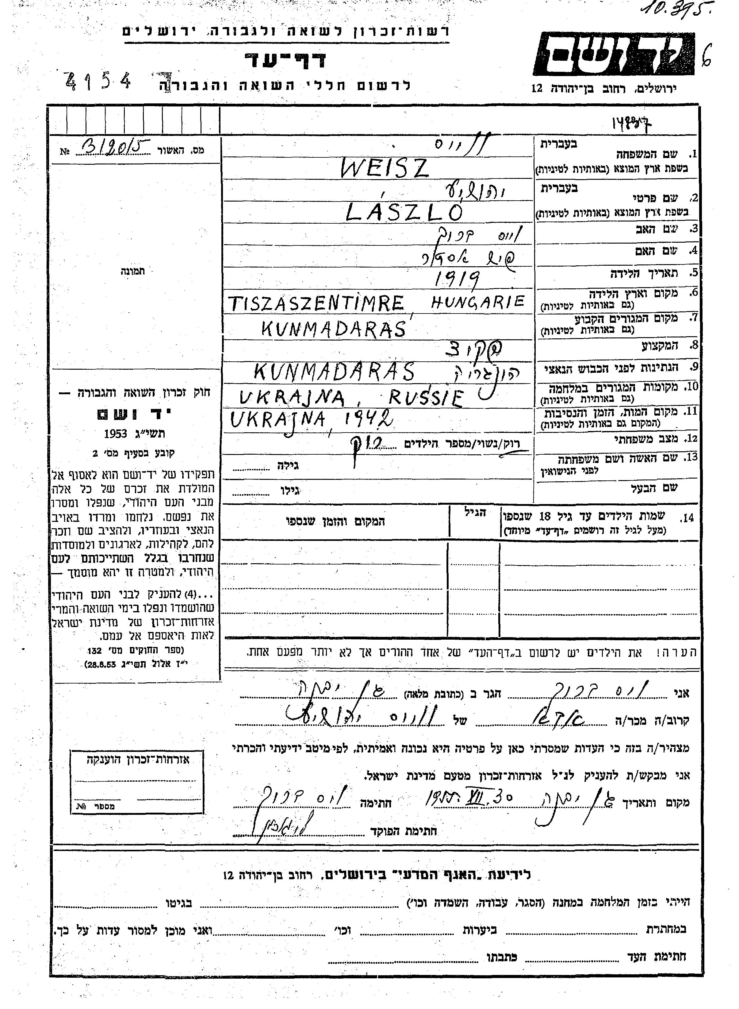 Weisz Laszlo יהושיע 1919 Kunmadaras, הונגריה דף-עד