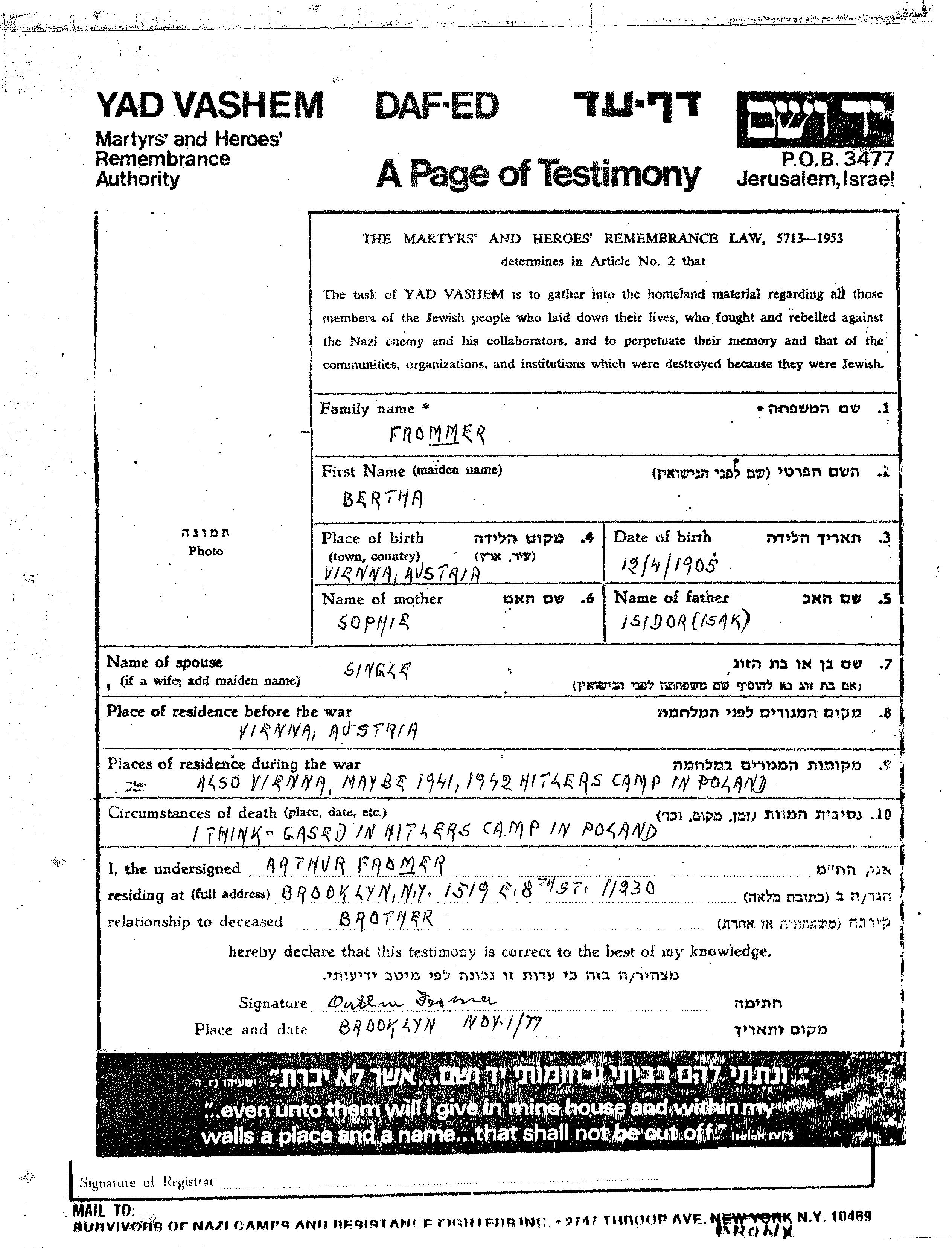 Bertha Frommer נולדה בVienna שבאוסטריה בשנת 1905 לIsidor איסק וSophie. היא היתה רווקה. לפני מלחמת העולם השניה התגוררה בVienna שבאוסטריה. בזמן המלחמה היא היתה בVienna שבאוסטריה.