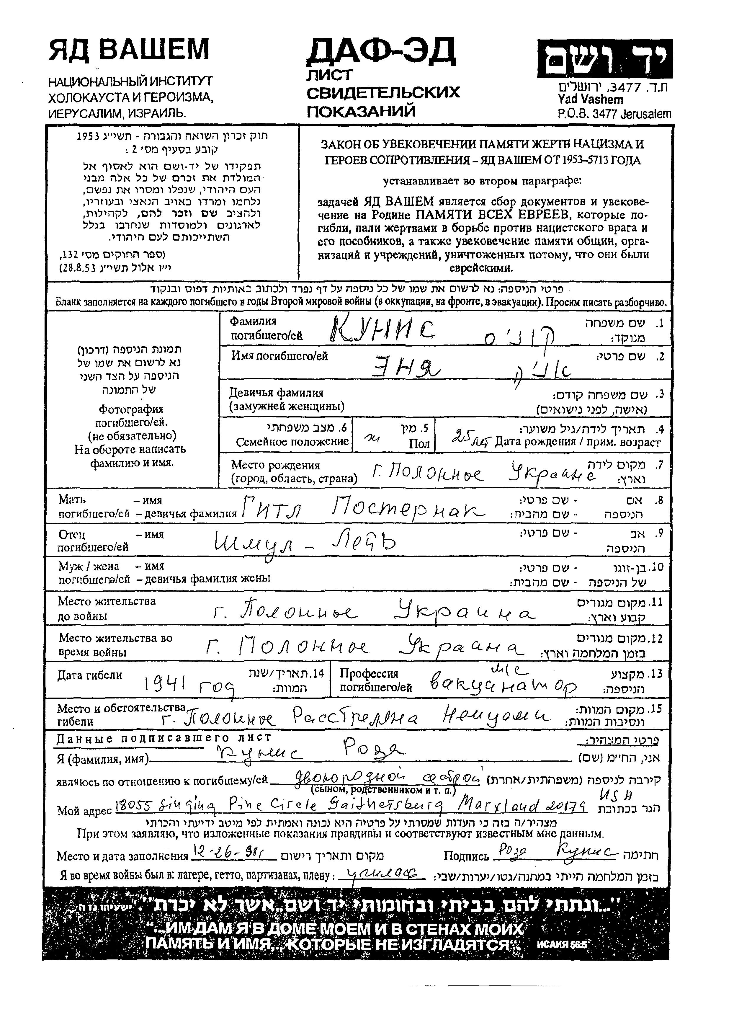 היא נרצחה בשואה. מקום המוות: Polonnoye שבאוקראינה (ברה"מ) בשנת 1941.