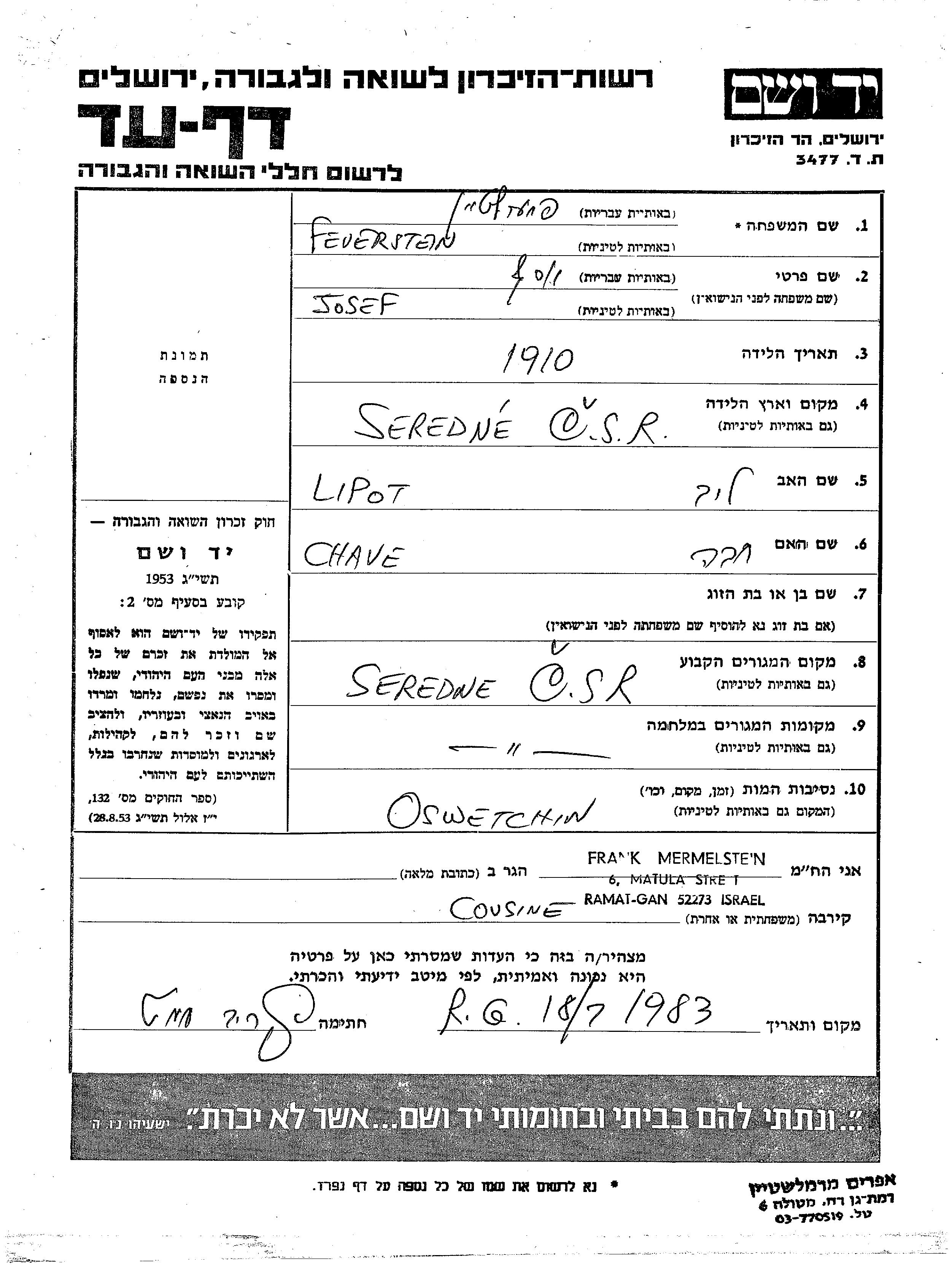 Feuerstein Josef 1910 Seredne, צ'כוסלובקיה דף-עד