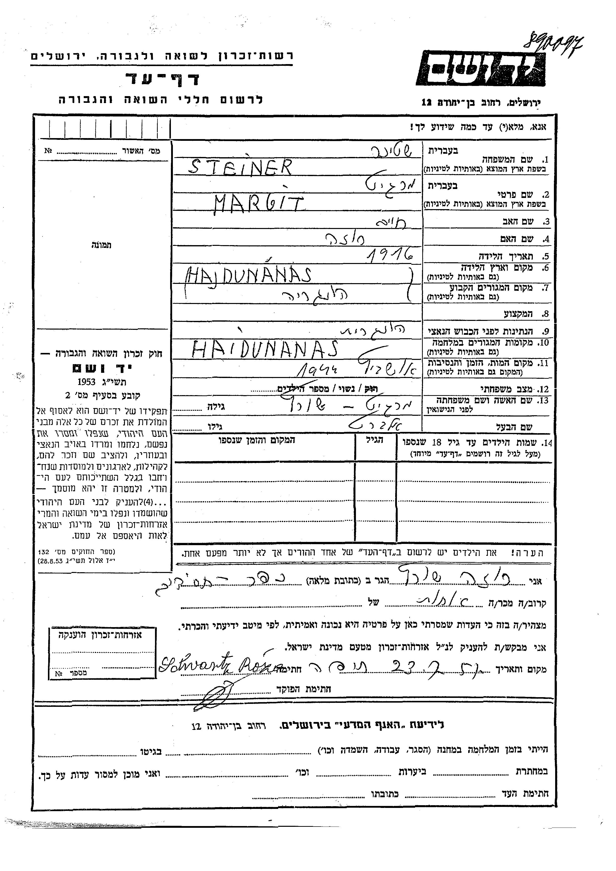 Margit Steiner לבית שורץ נולדה בHajdunanas שבהונגריה בשנת 1916 לחיים ורוזה. היא היתה נשואה לאלברט. לפני מלחמת העולם השניה התגוררה בהונגריה. בזמן המלחמה היא היתה בHajdunanas שבהונגריה.