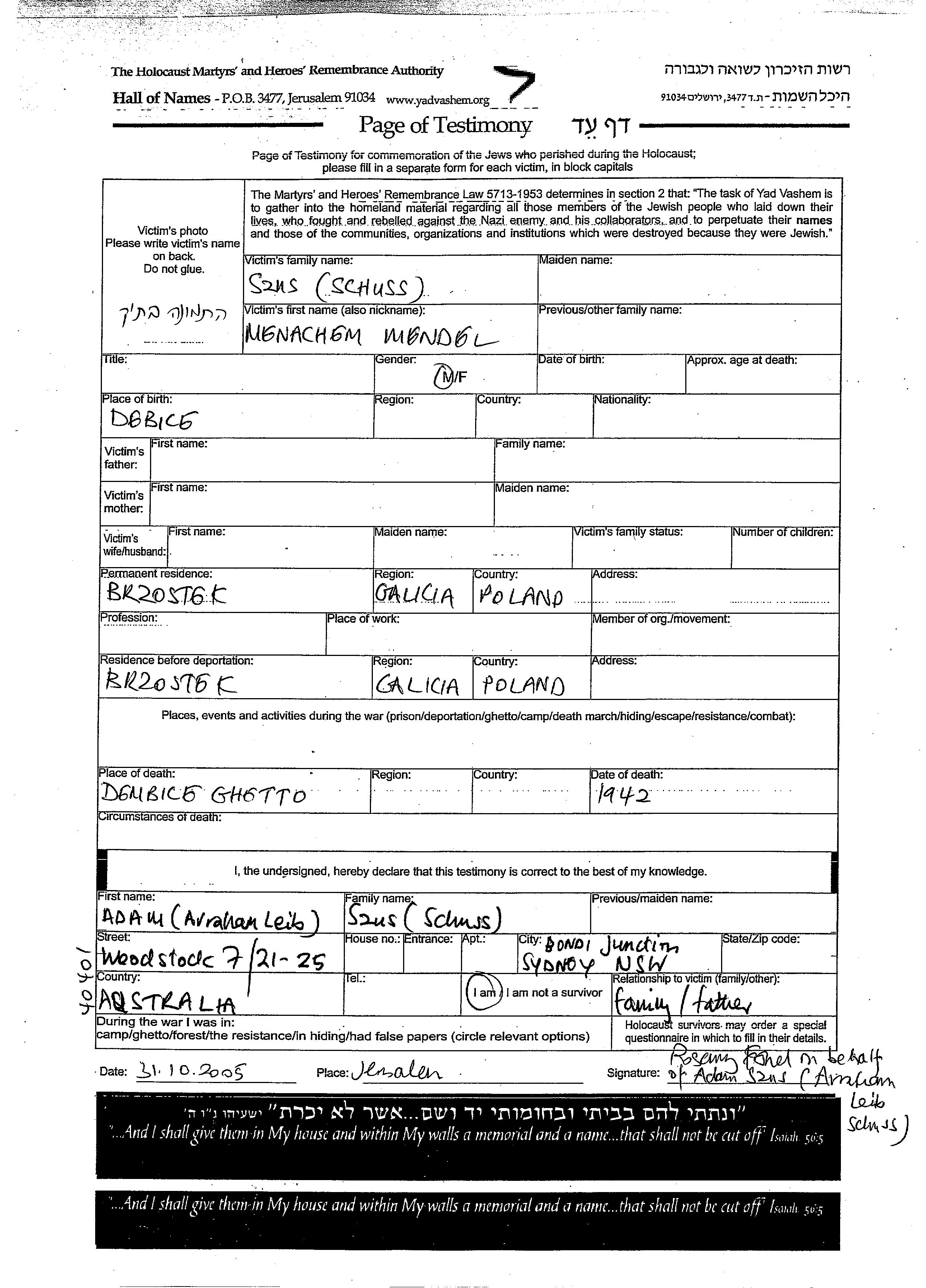 Menachem מנדל Szus נולד בDebica שבפולין. לפני מלחמת העולם השניה התגורר בBrzostek שבפולין. בזמן המלחמה הוא היה בBrzostek שבפולין.