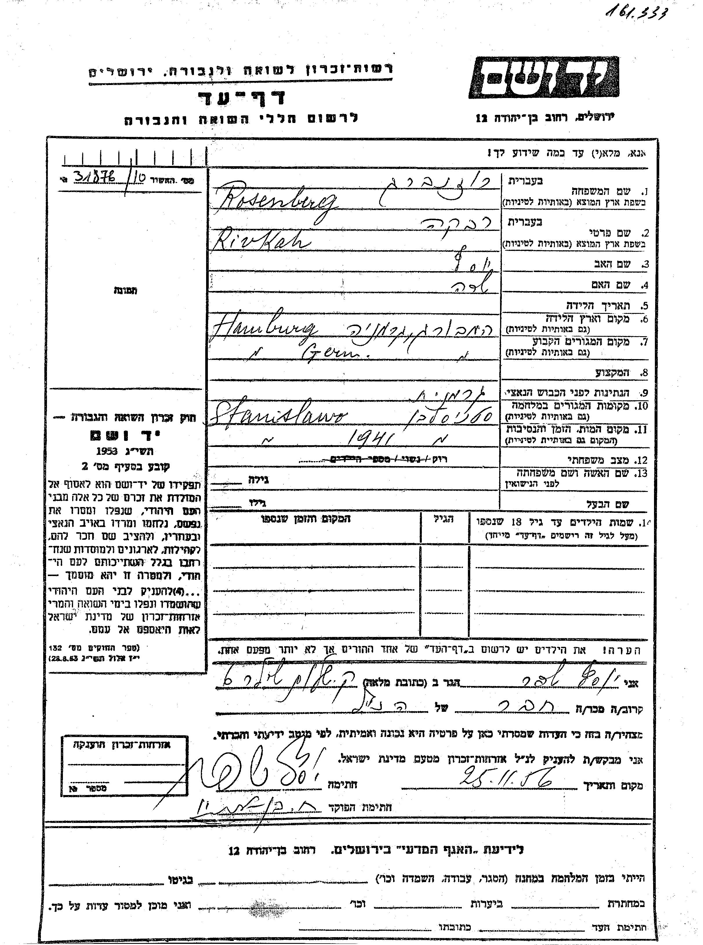 Rivkah Rosenberg נולדה בHamburg שבגרמניה ליוסף ושרה. היא היתה רווקה. לפני מלחמת העולם השניה התגוררה בHamburg שבגרמניה. בזמן המלחמה היא היתה בStanislawow שבפולין. היא נרצחה בשואה. מקום המוות: Stanislawow שבפולין בשנת 1941.