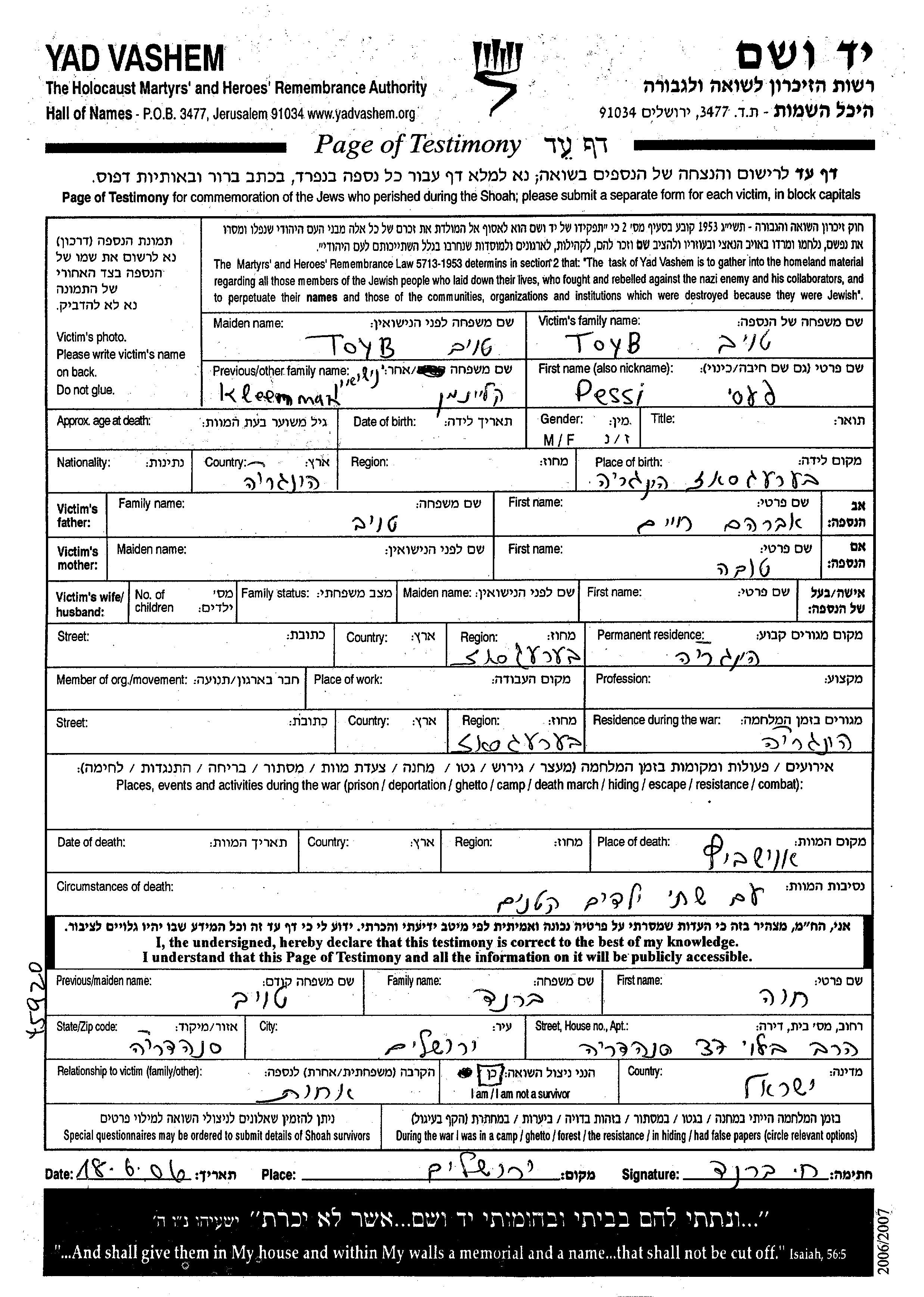 Pessi Toyb לבית קליינמן נולדה בBeregszasz שבצ'כוסלובקיה לחיים אברהם וטובה. לפני מלחמת העולם השניה התגוררה בBeregszasz שבצ'כוסלובקיה. בזמן המלחמה היא היתה בBeregszasz שבצ'כוסלובקיה.