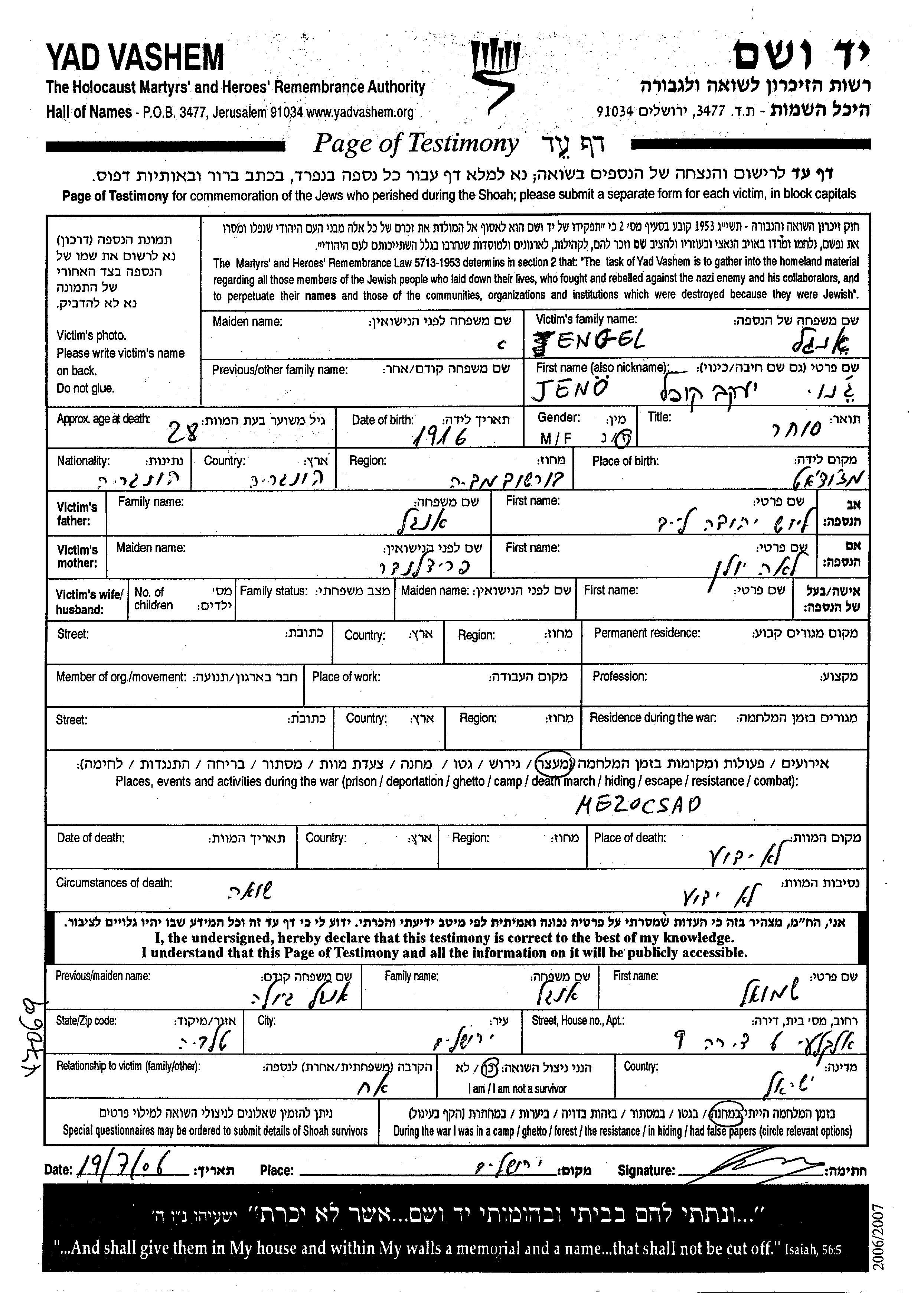 גנו קופל Jeno אנגל נולד בMezocsat שבהונגריה בשנת 1916 ללייב יהודה ליוש ויולן לאה לבית פרידלנדר. הוא היה סוחר. לפני מלחמת העולם השניה התגורר בMezocsat שבהונגריה. בזמן המלחמה הוא היה בMezocsat שבהונגריה. גנו קופל Jeno נרצח בשואה.