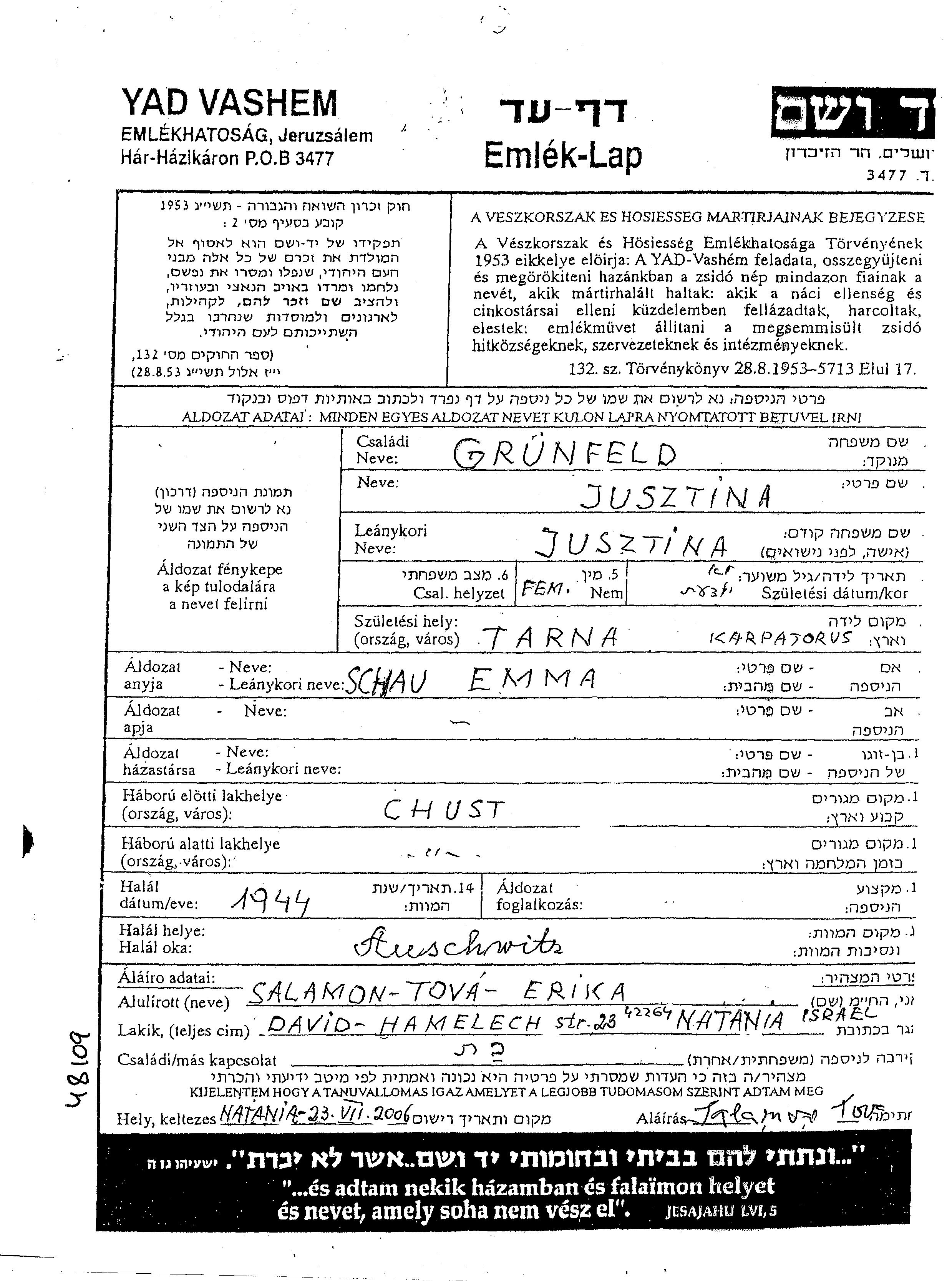 Jusztina Gruenfeld נולדה בTarna שבצ'כוסלובקיה לEmma לבית Schau. לפני מלחמת העולם השניה התגוררה בChust שבצ'כוסלובקיה. בזמן המלחמה היא היתה בChust שבצ'כוסלובקיה. היא נרצחה בשואה. מקום המוות: Auschwitz שבפולין בשנת 1944.