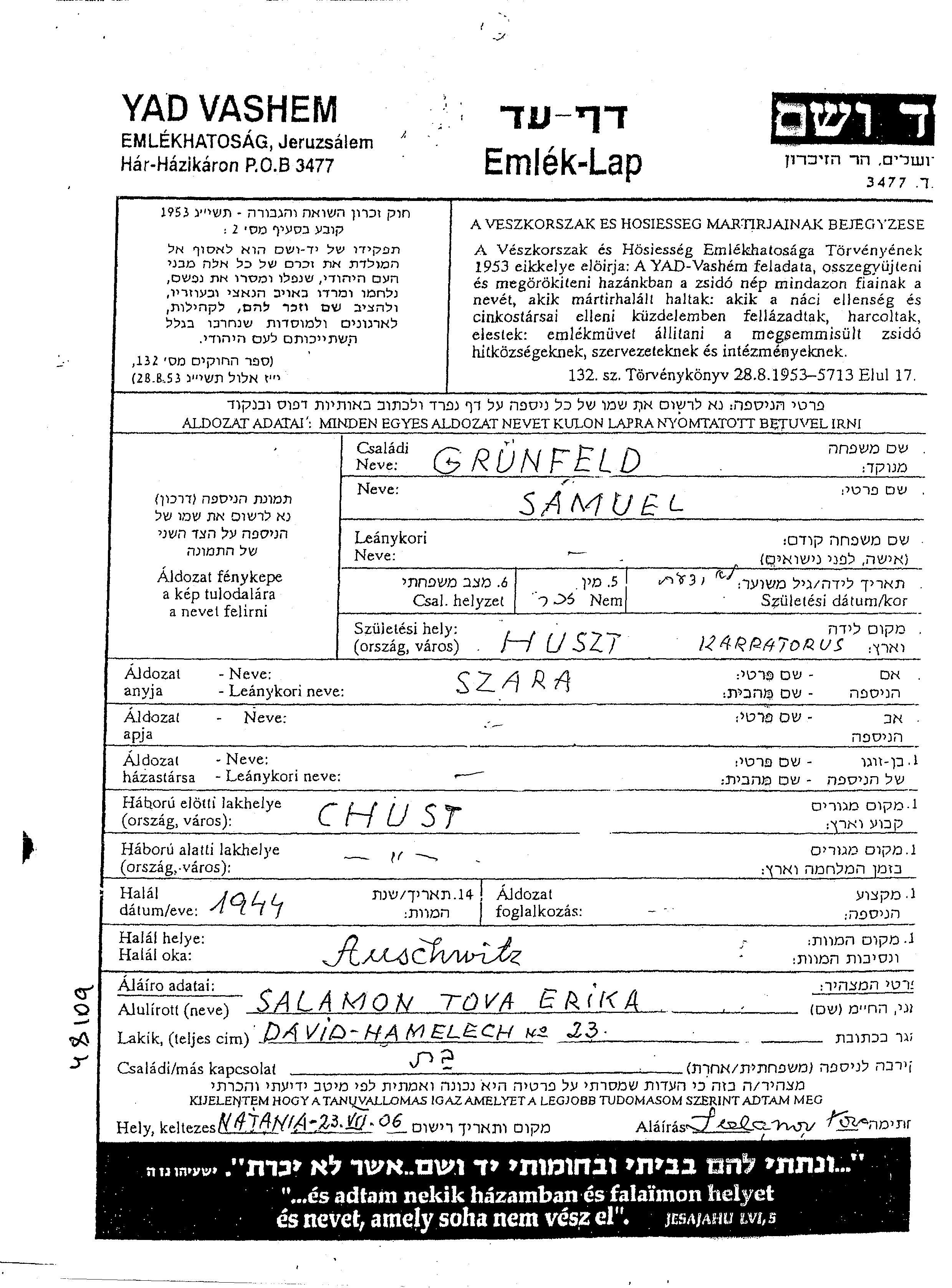 סמואל Gruenfeld נולד בHuszt שבצ'כוסלובקיה לSzara. לפני מלחמת העולם השניה התגורר בHuszt שבצ'כוסלובקיה. בזמן המלחמה הוא היה בHuszt שבצ'כוסלובקיה. סמואל נרצח בשואה. מקום המוות: Auschwitz שבפולין בשנת 1944.