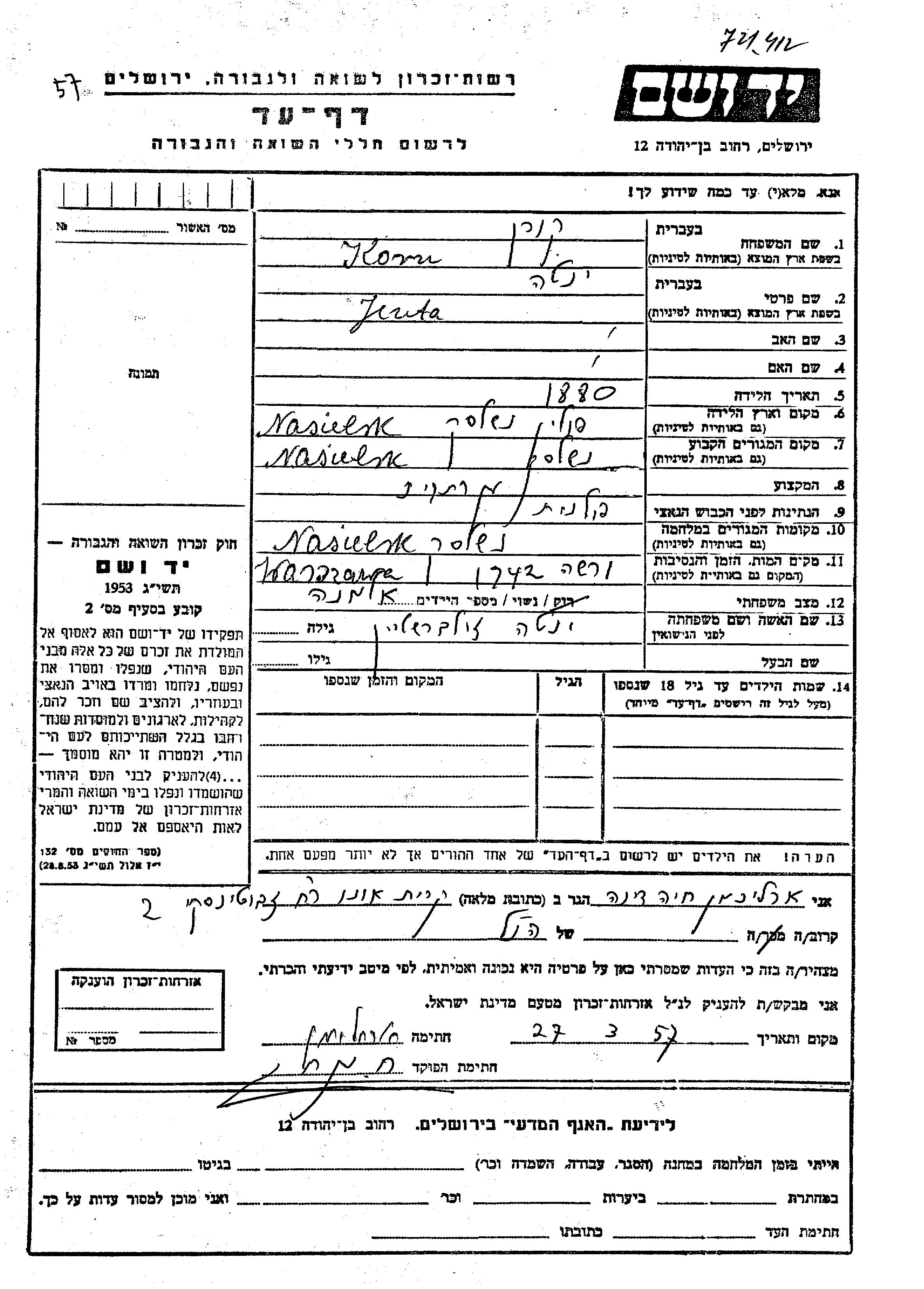 ינטה קורן לבית זילברשטיין נולדה בNasielsk שבפולין בשנת 1880. היא היתה עקרת בית ואלמנה. לפני מלחמת העולם השניה התגוררה בNasielsk שבפולין. בזמן המלחמה היא היתה בNasielsk שבפולין. ינטה נרצחה בשואה. מקום המוות: Warszawa שבפולין בשנת 1942.