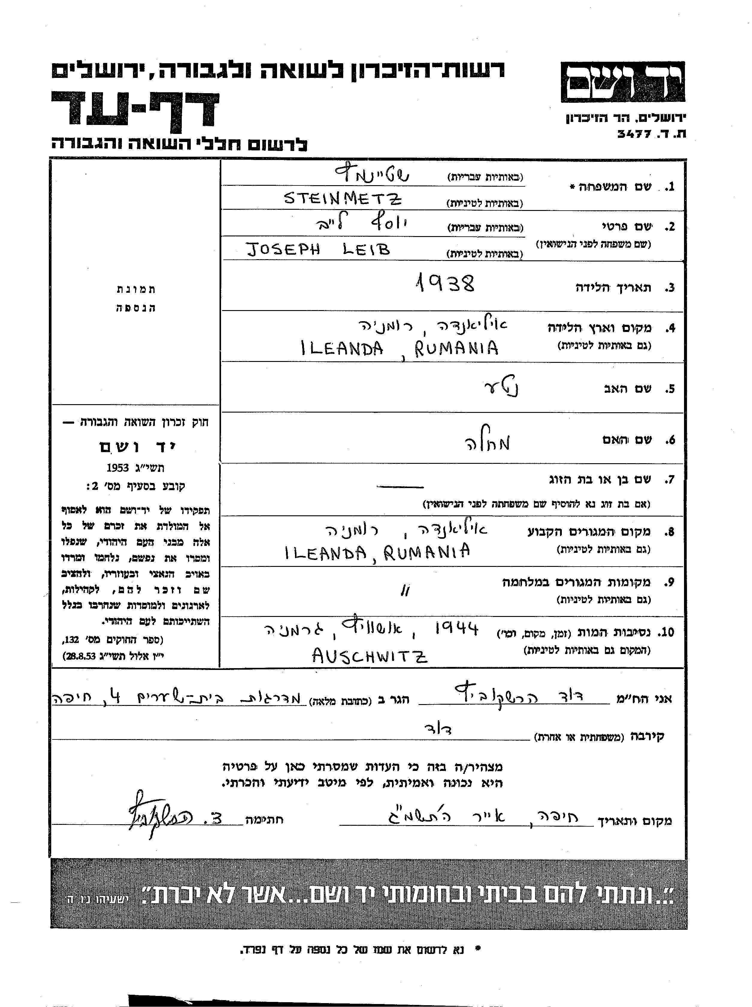 יוסף לייב Steinmetz נולד בIleanda שברומניה בשנת 1938 לנטע ומחלה. לפני מלחמת העולם השניה התגורר בIleanda שברומניה. בזמן המלחמה הוא היה בIleanda שברומניה.