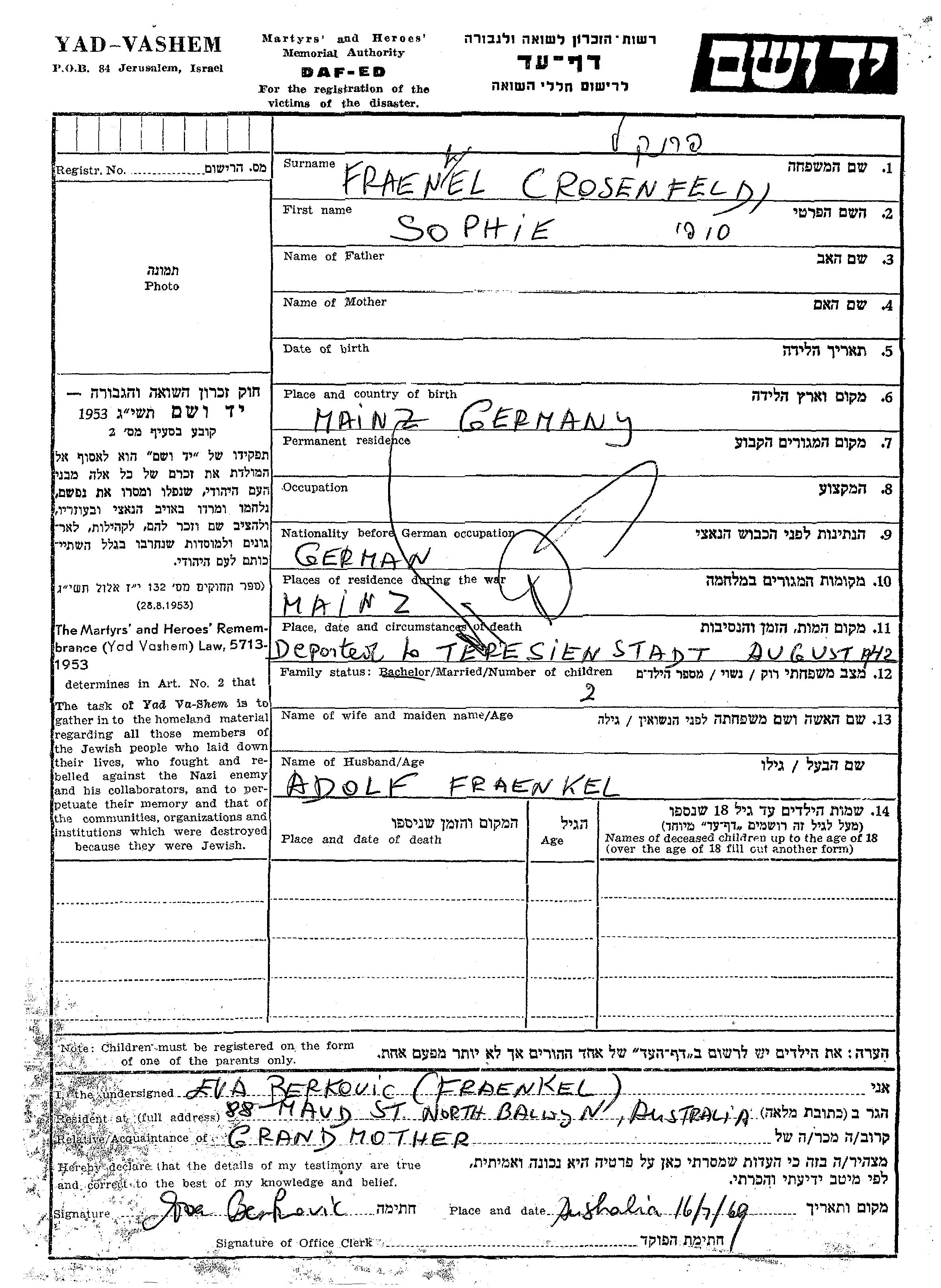 Sophie Fraenkel לבית Rosenfeld נולדה בMainz שבגרמניה. היא היתה נשואה לאדולף. בזמן המלחמה היא היתה בMainz שבגרמניה.