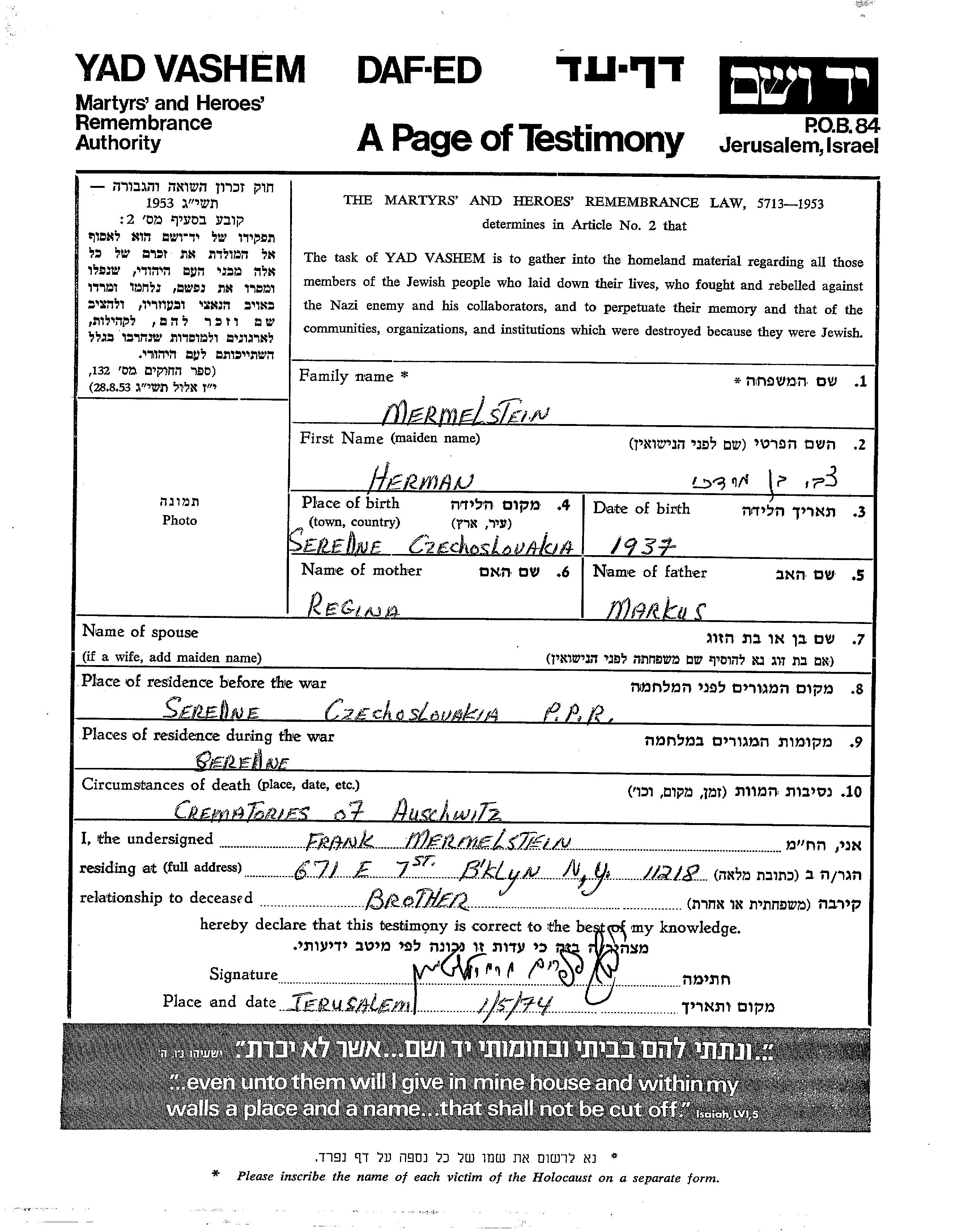 Mermelstein הרמן צבי 1937 Seredne, צ'כוסלובקיה דף-עד