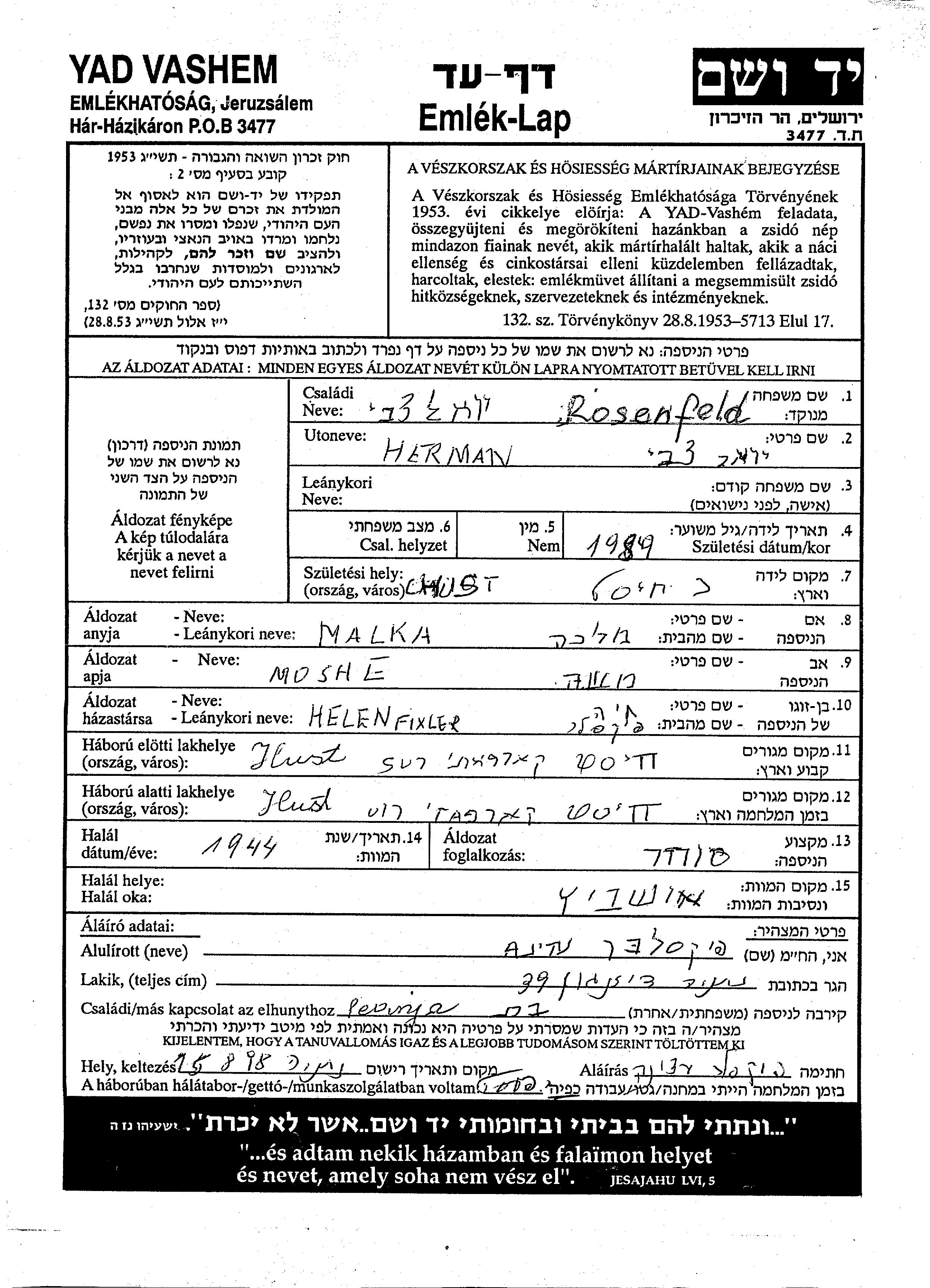 Rosenfeld הרמן יואל צבי 1889 Hust, צ'כוסלובקיה דף-עד