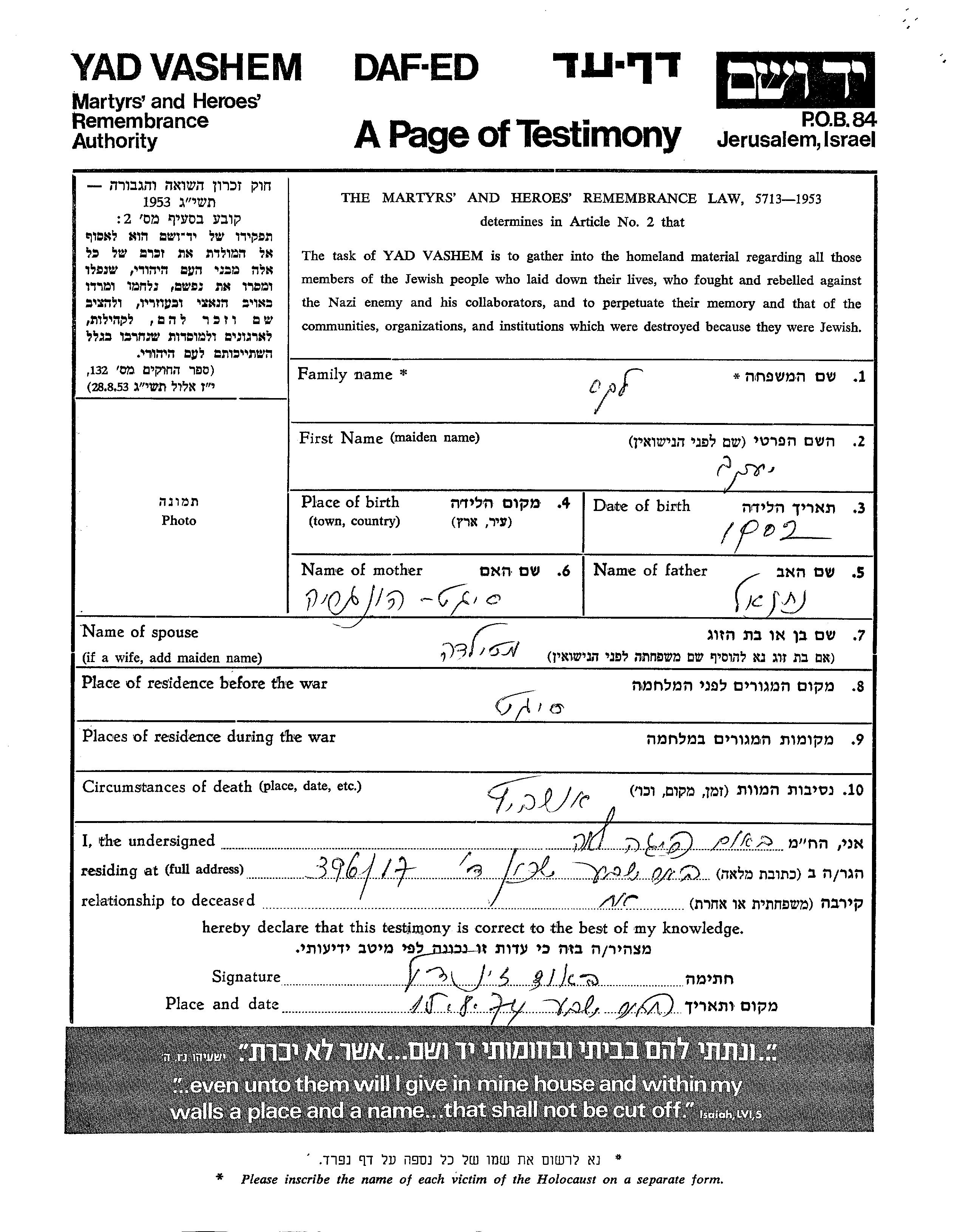 יעקב נרצח בשואה. מקום המוות: Auschwitz שבפולין.